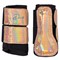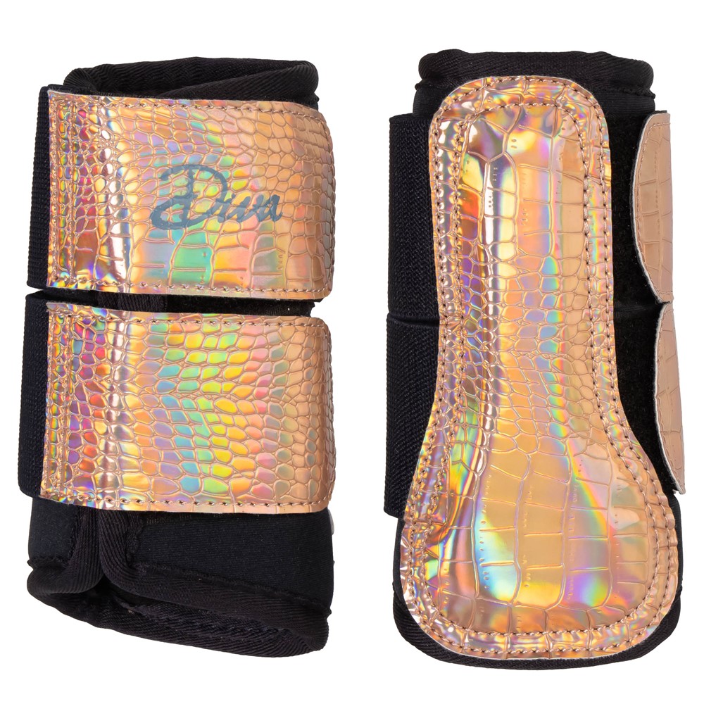 Schöne glänzende Gamaschen, die sich geschmeidig um das Pferdebein legen und sich einfach mit Klettverschluss schließen lassen.