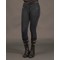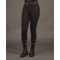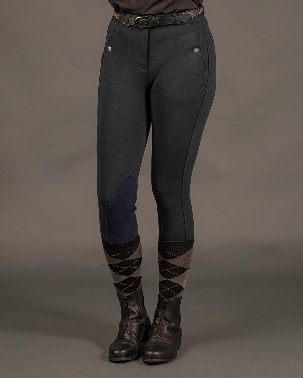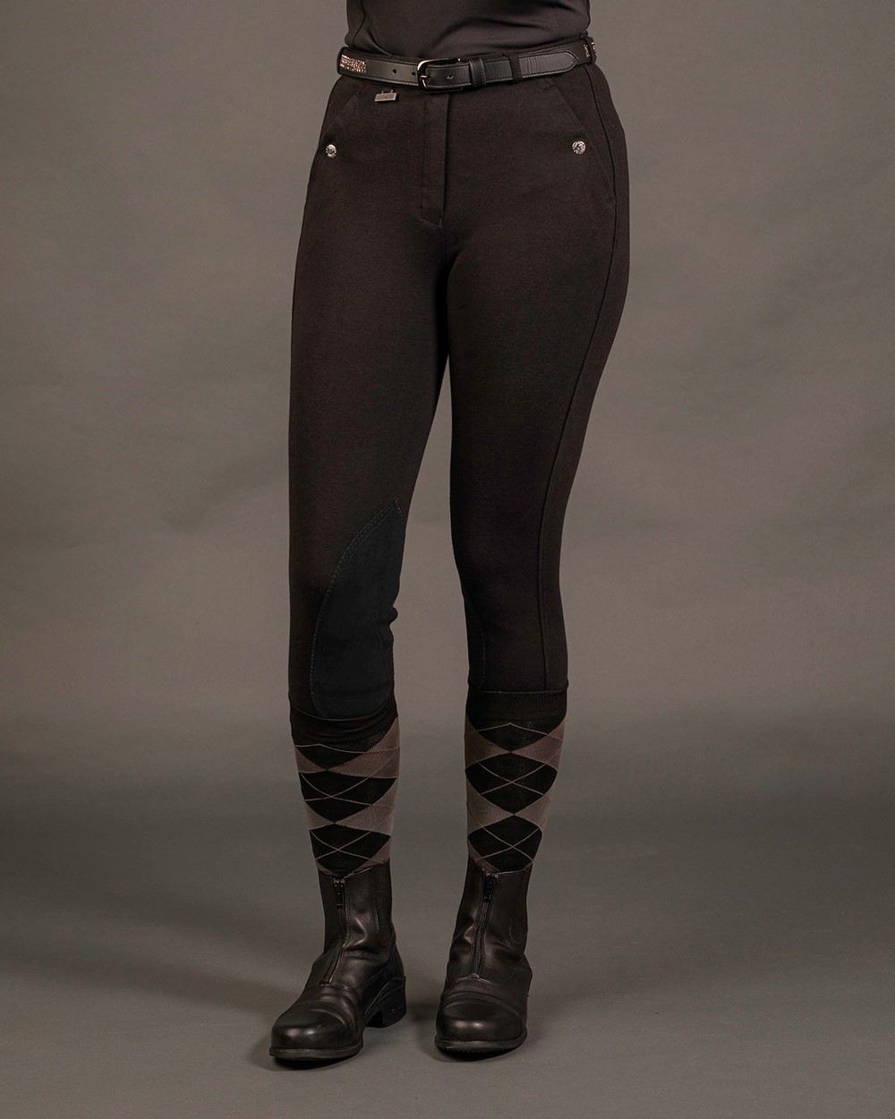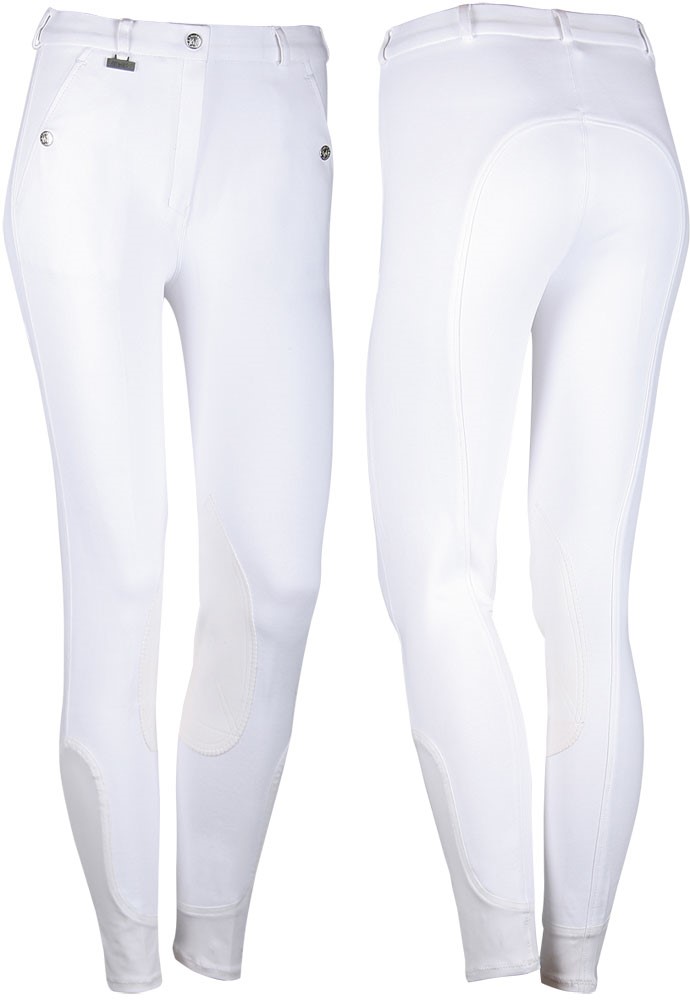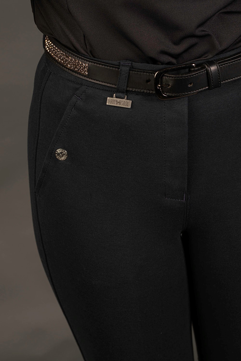 Reithose mit Einschubtaschen und Druckknopfverschluss, Schiebeschnalle und Reißverschluss, Gürtelschlaufen, elastischer Kniebesatz aus Kunstleder und Elastiek-Einsatz am Hosenbein.