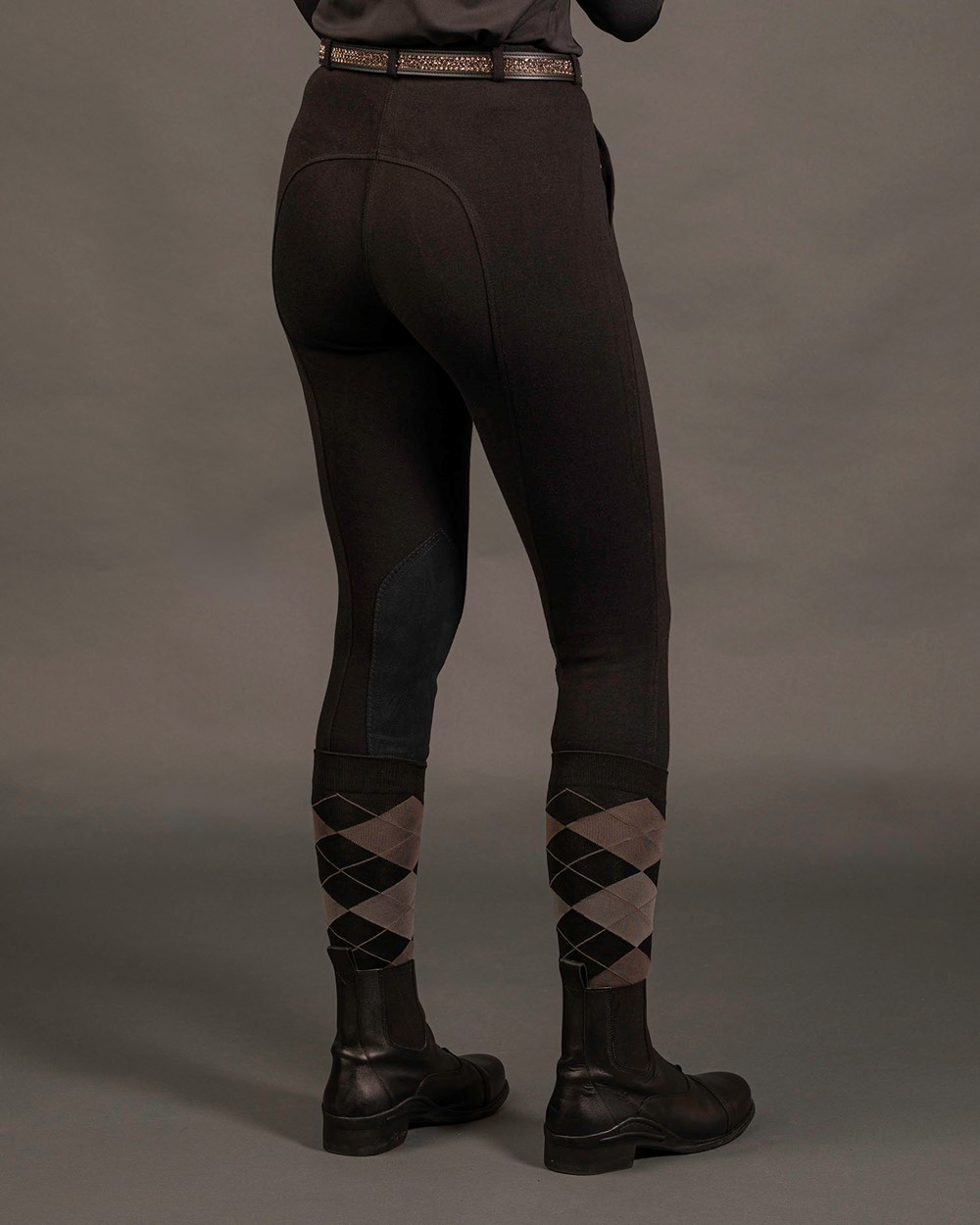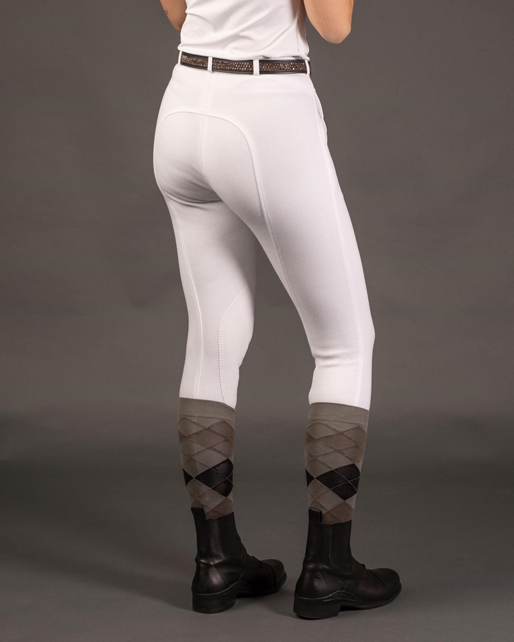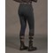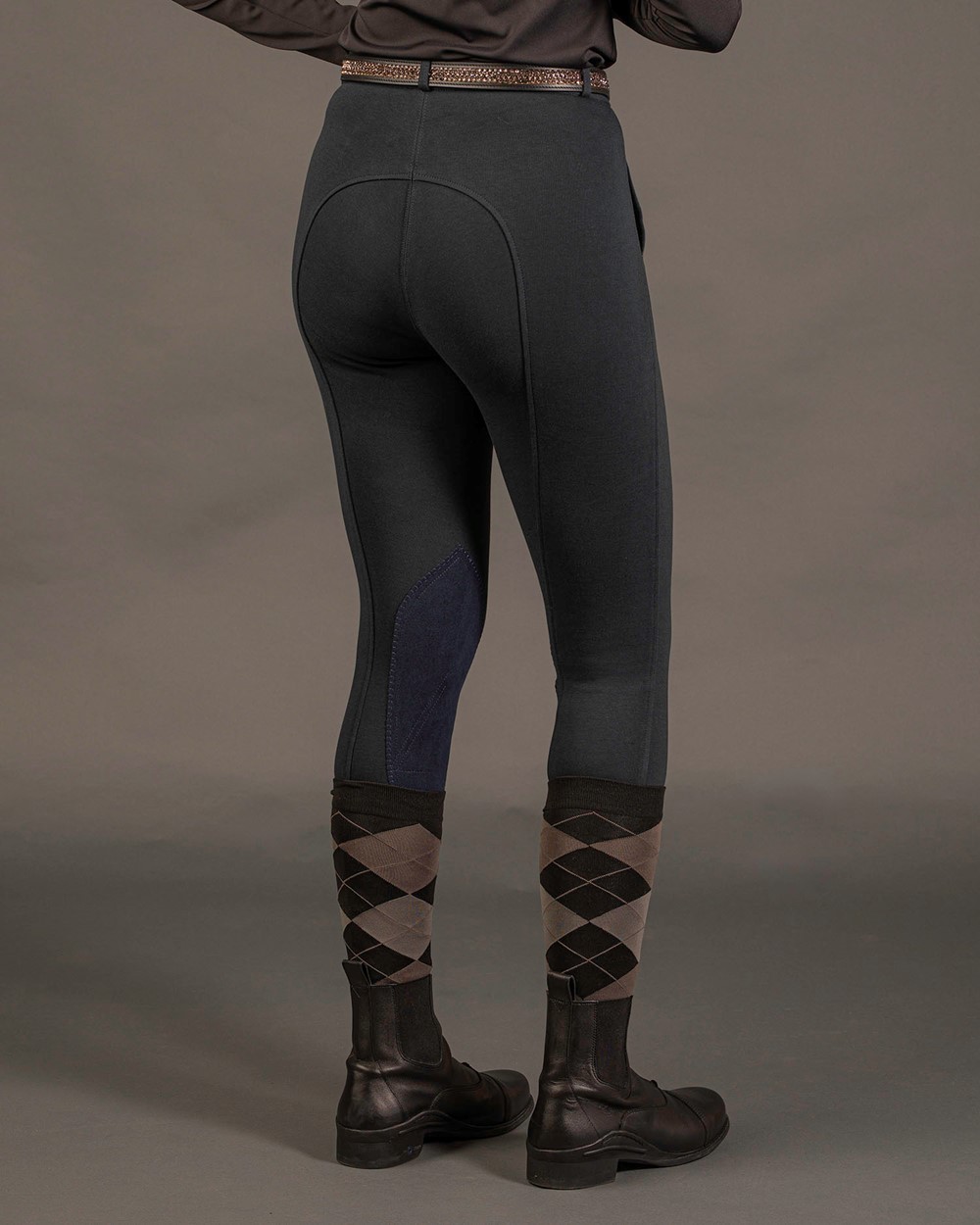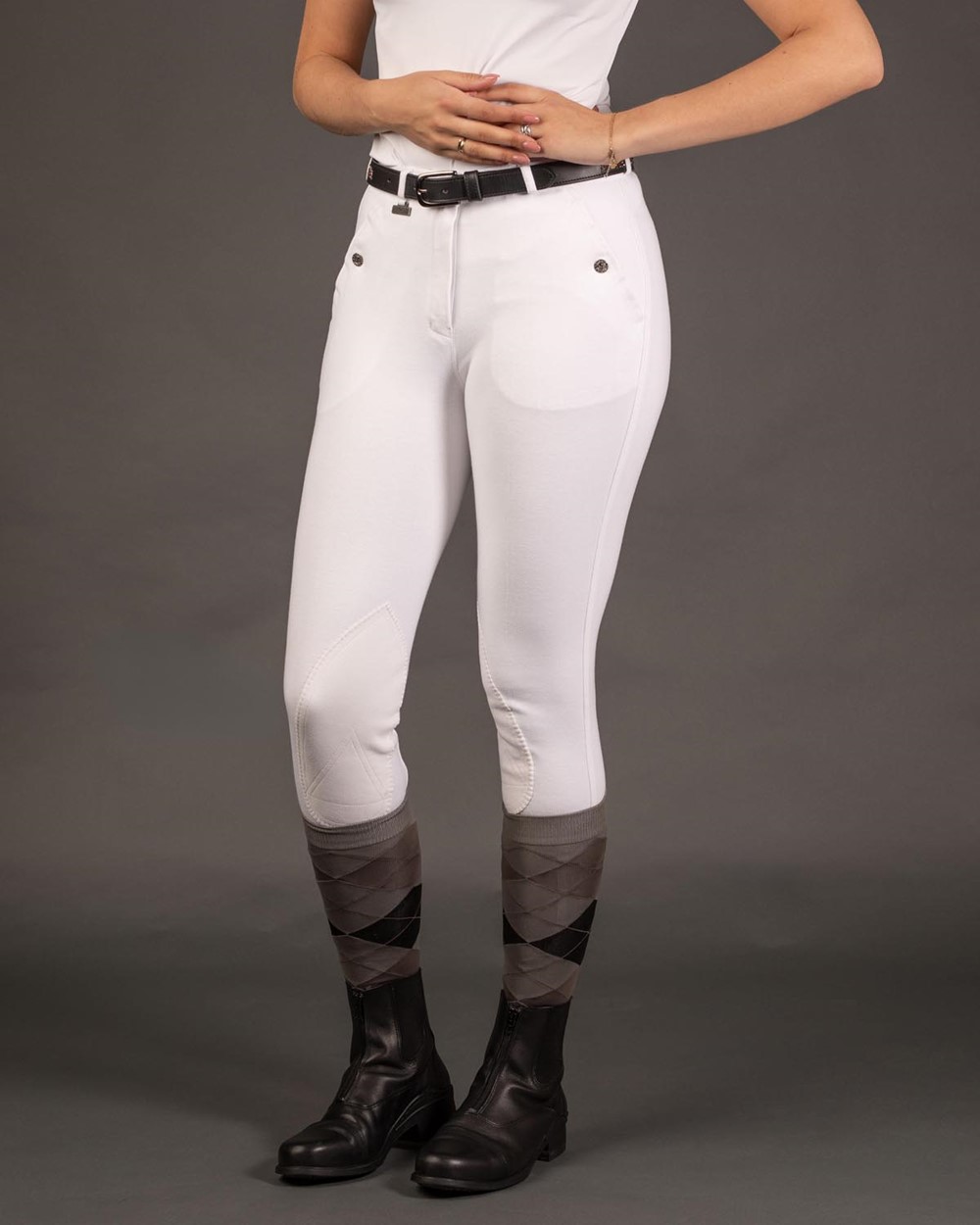 Reithose mit Einschubtaschen und Druckknopfverschluss, Schiebeschnalle und Reißverschluss, Gürtelschlaufen, elastischer Kniebesatz aus Kunstleder und Elastiek-Einsatz am Hosenbein.