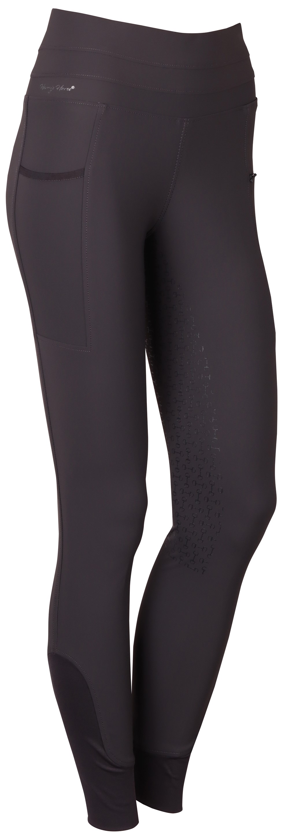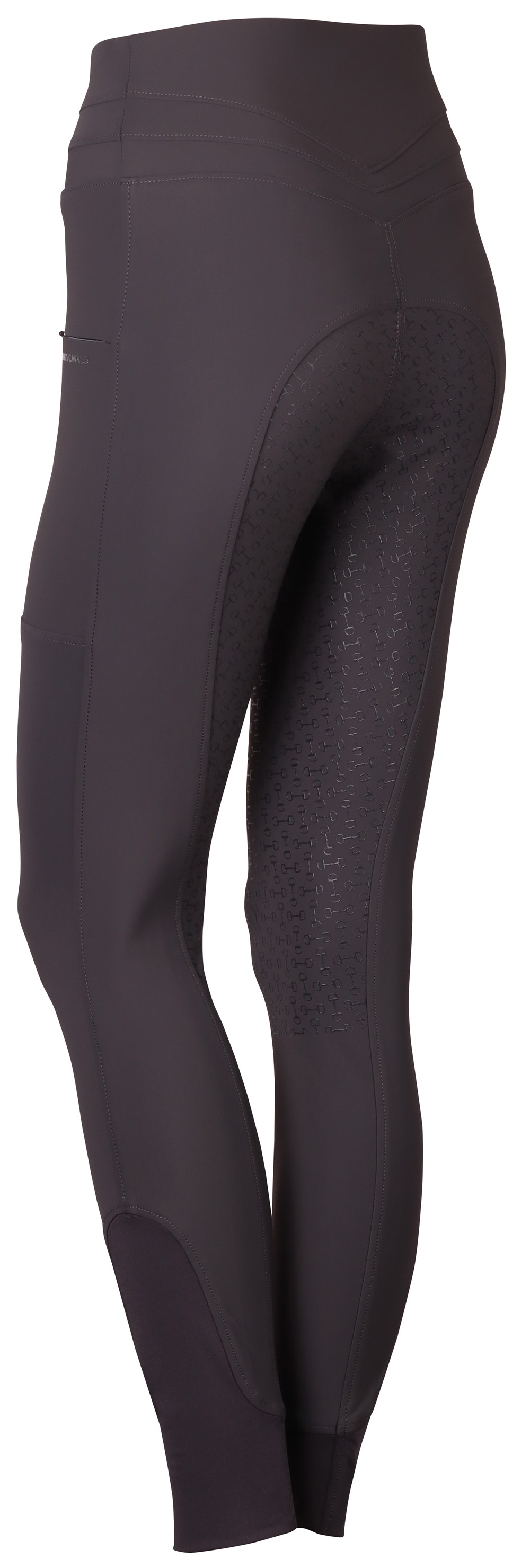 Reitleggings mit hohem Bund und V-förmigem Stoffeinsatz auf der Rückseite, zwei Taschen, eine davon mit Reißverschluss, rundgenähter Gesäßbereich mit Silikonprint und elastischem Einsatz um die Knöchel für mehr Komfort in deinen Reitstiefeln.