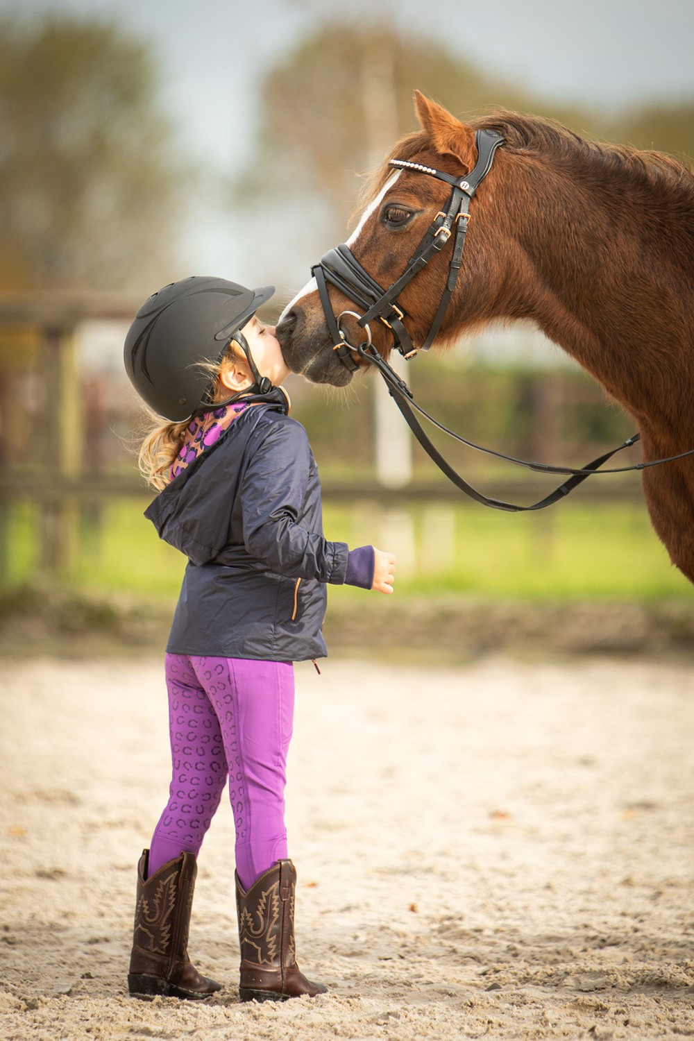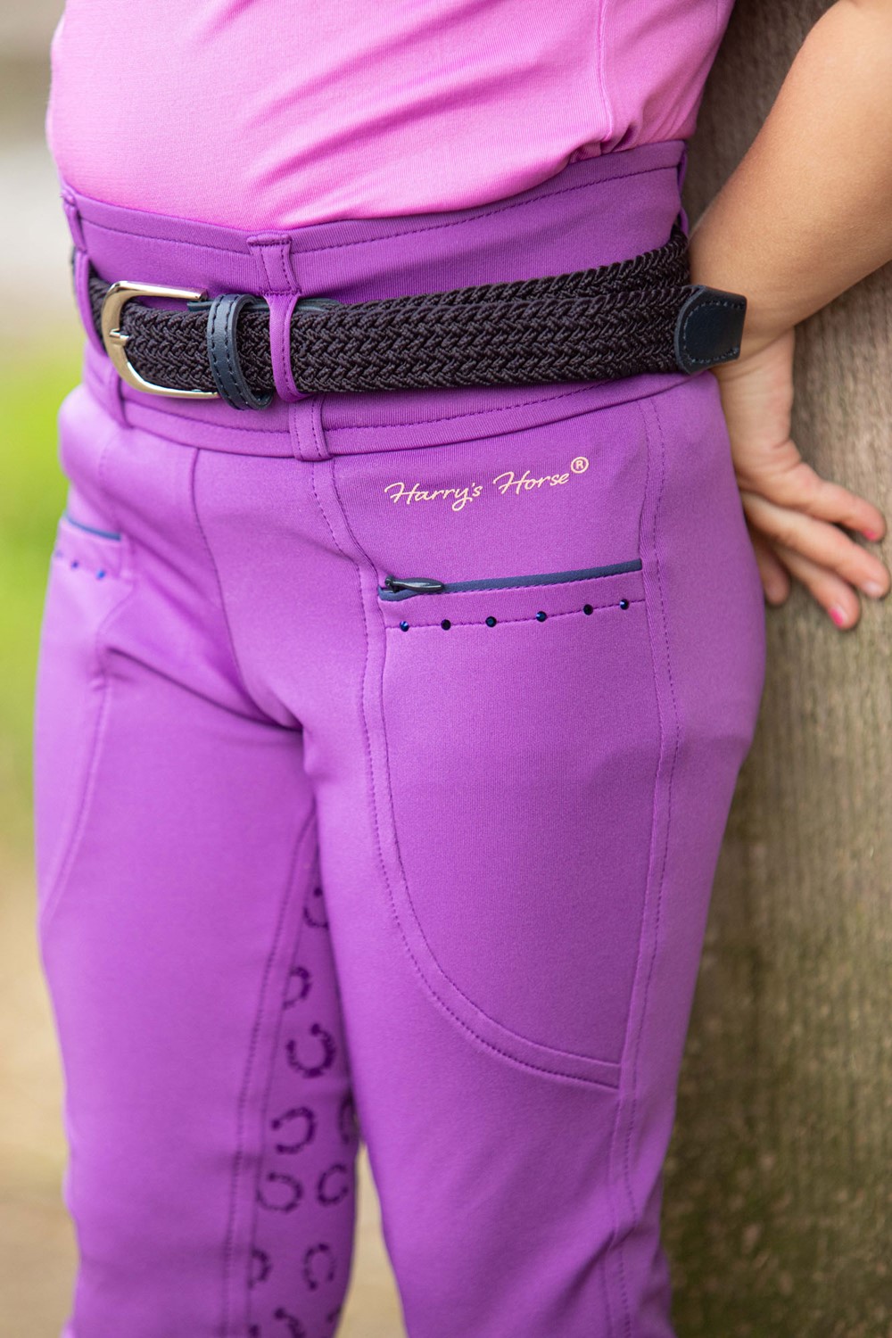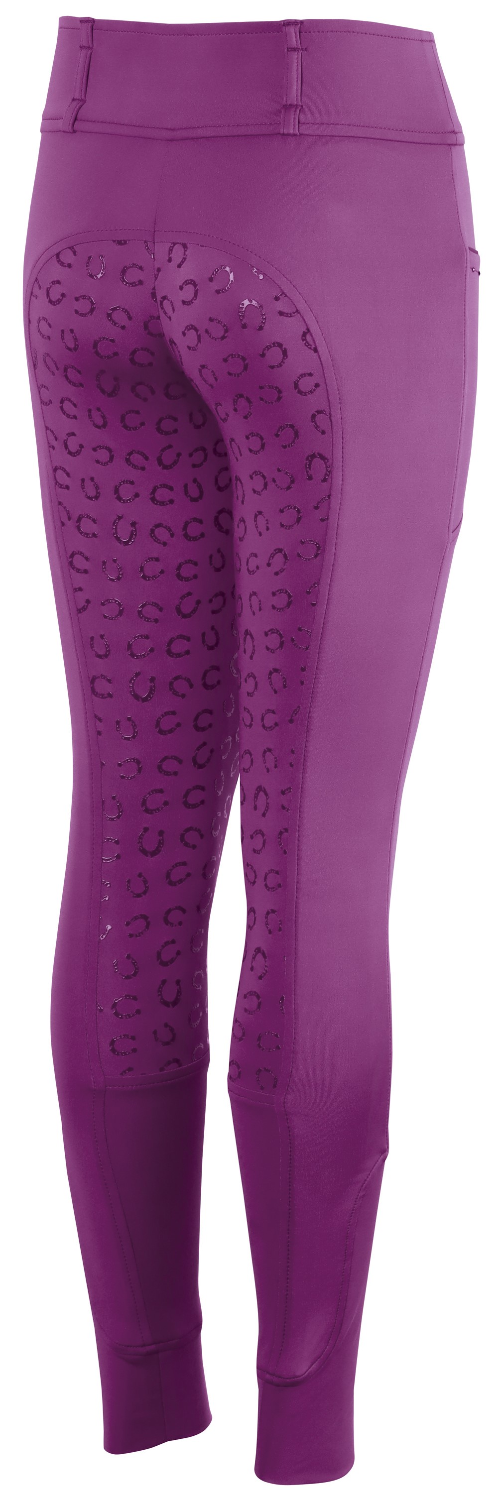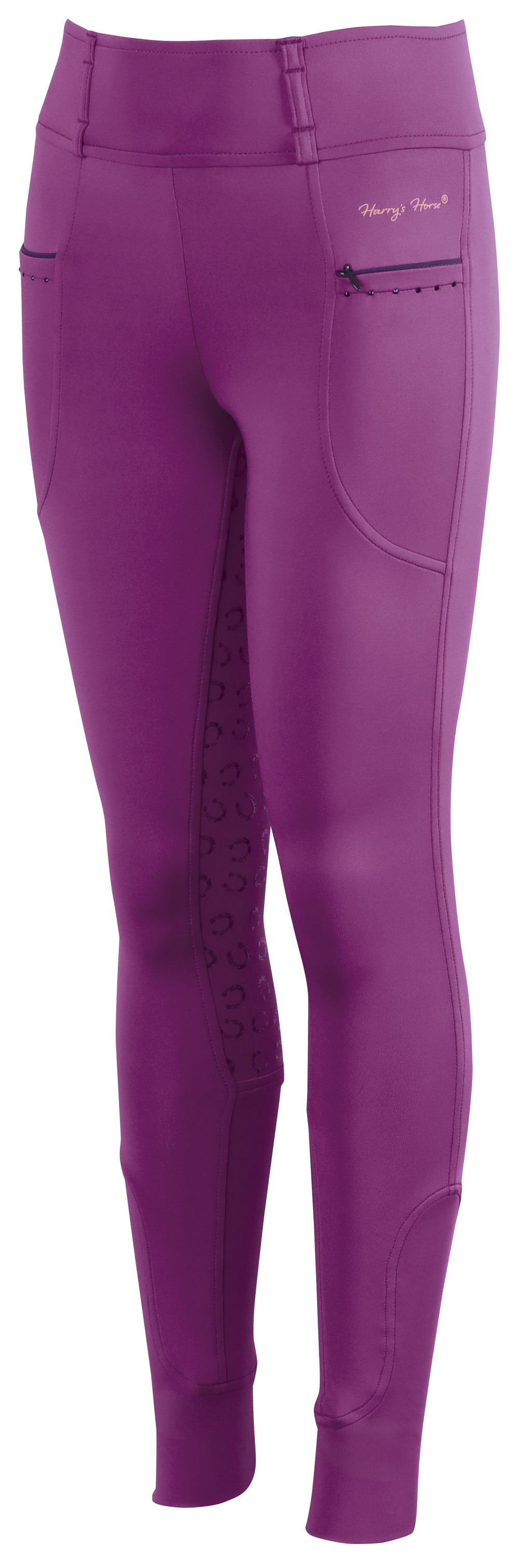 Reitleggings mit zwei Taschen, davon eine mit Reißverschluss, Kristalldetails und kontrastierenden Paspeln. Der hohe Bund ist mit Gürtelschlaufen versehen. Der Vollbesatz hat einen Silikon-Hufeisenprint für zusätzlichen Halt im Sattel. Ein elastischer Einsatz an den Knöcheln sorgt für mehr Komfort in den Reitstiefeln.