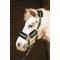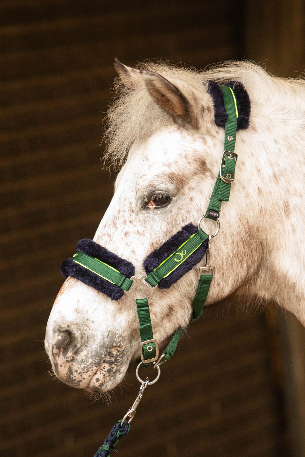 Halfterset mit weicher Kunstfellpolsterung und kontrastierenden Details. Das Genickstück ist beidseitig verstellbar, die Nasenriemen ebenfalls verstellbar. Inklusive Führstrick (Länge: 2 Meter).
