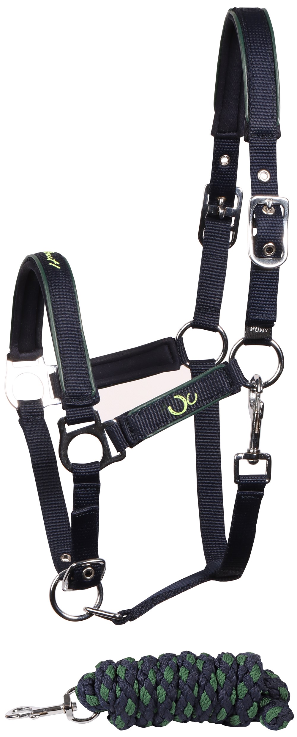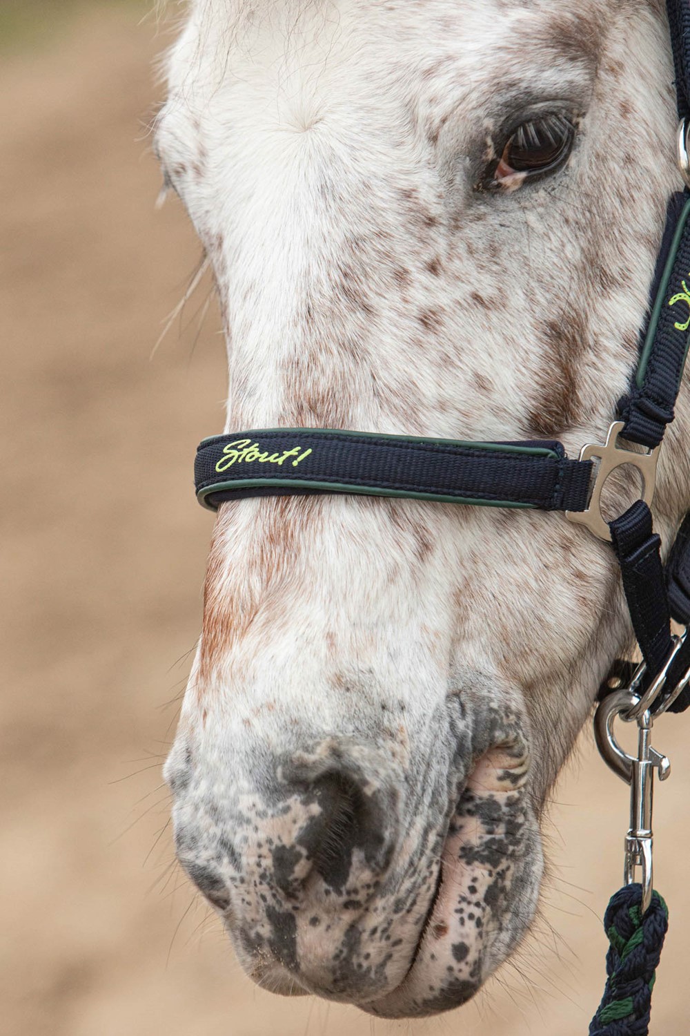 Halfterset mit Kontrastpaspelierung und STOUT!-Print auf dem Nasenriemen und den Backenstücken. Weich gepolstert mit Neoprenfutter. Das Genickstück ist beidseitig verstellbar, ebenso der Nasenriemen. Inklusive Führstrick (2 Meter).
