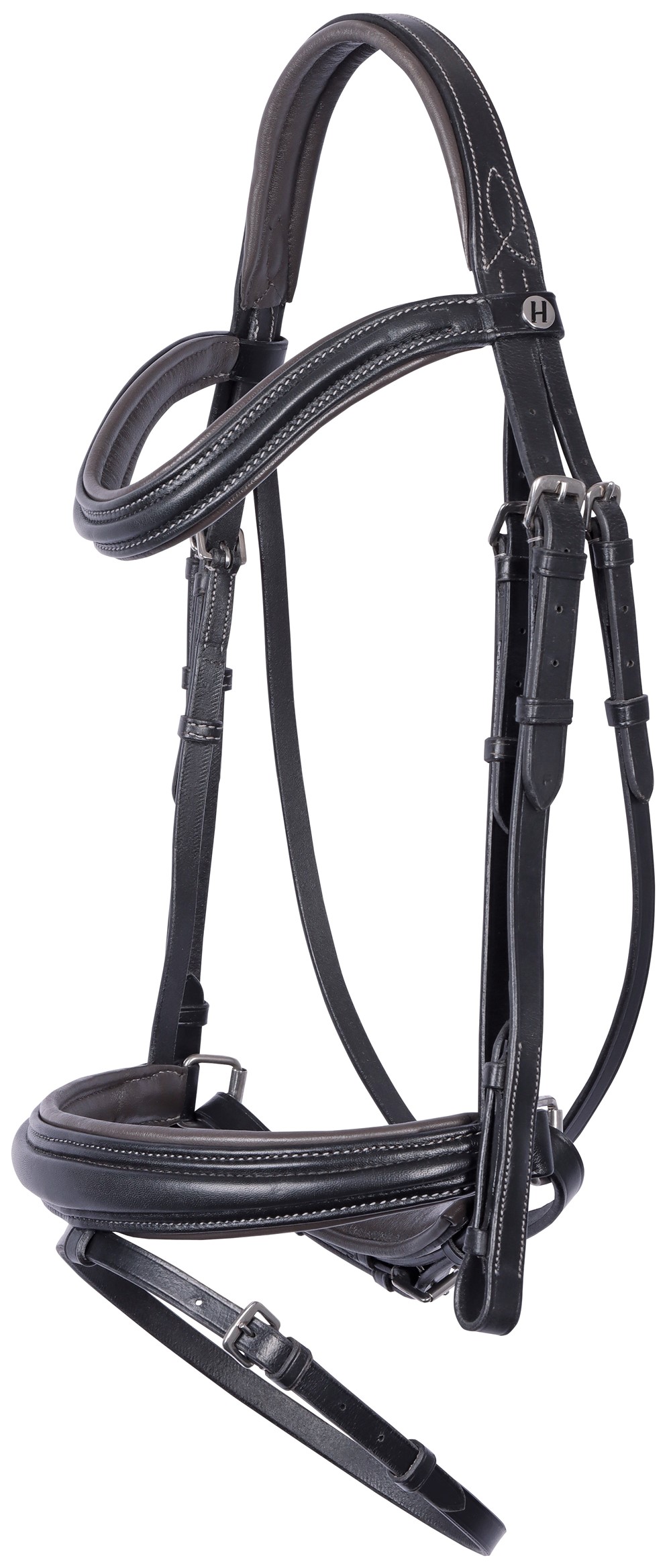 "Luxuriöse Trense mit Edelstahlschnallen, mit extra weichem Polster unter Genickstück, Stirnband und Nasenriemen.