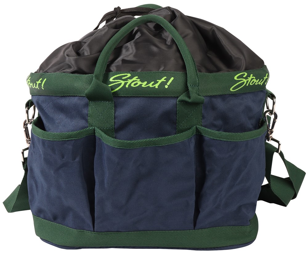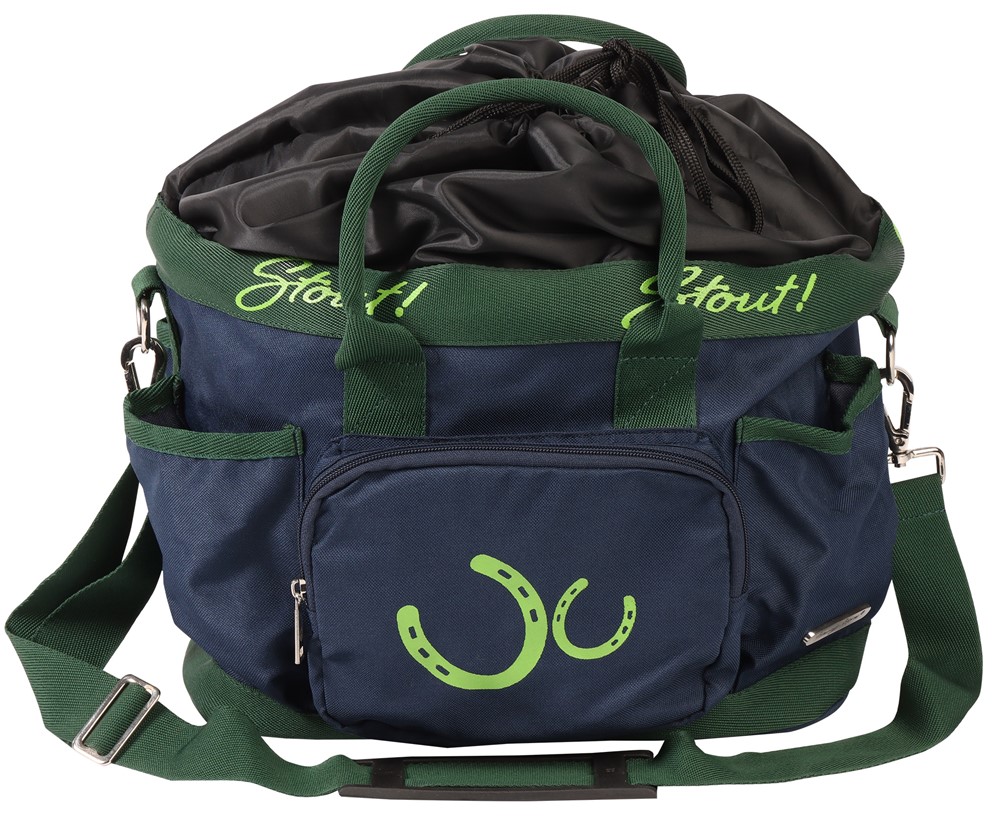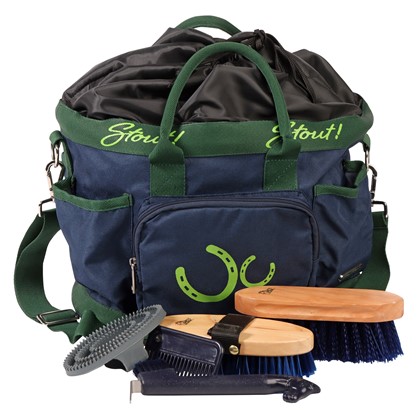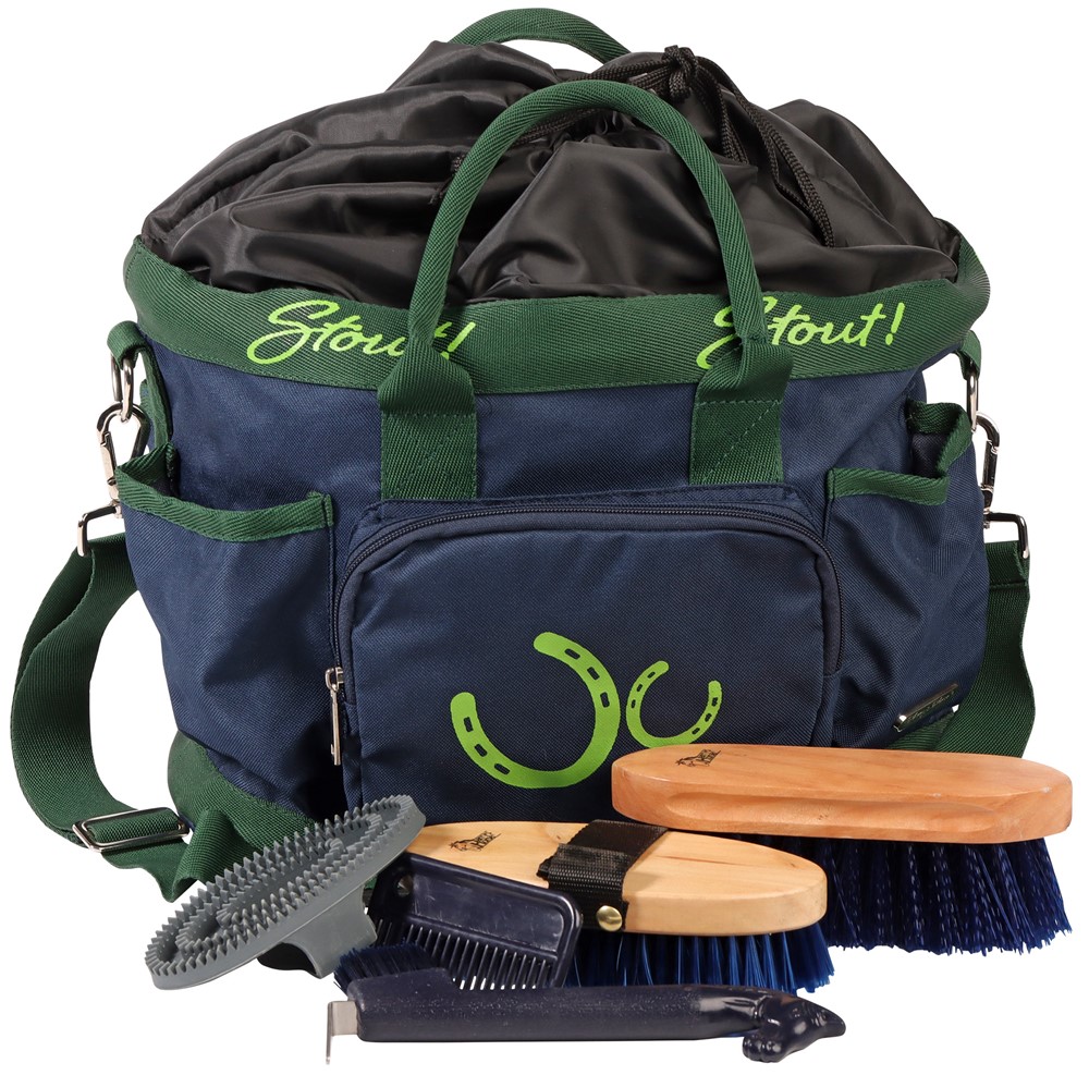Putzbeutel mit Kordelzug und mehreren Außentaschen. Mit farbenfrohen Details und STOUT!-Logo an der Seite. Komplett ausgestattet mit einem Gummistriegel, einer Wurzelbürste, einem Hufkratzer, einer Glanzbürste und einem Mähnenkamm.