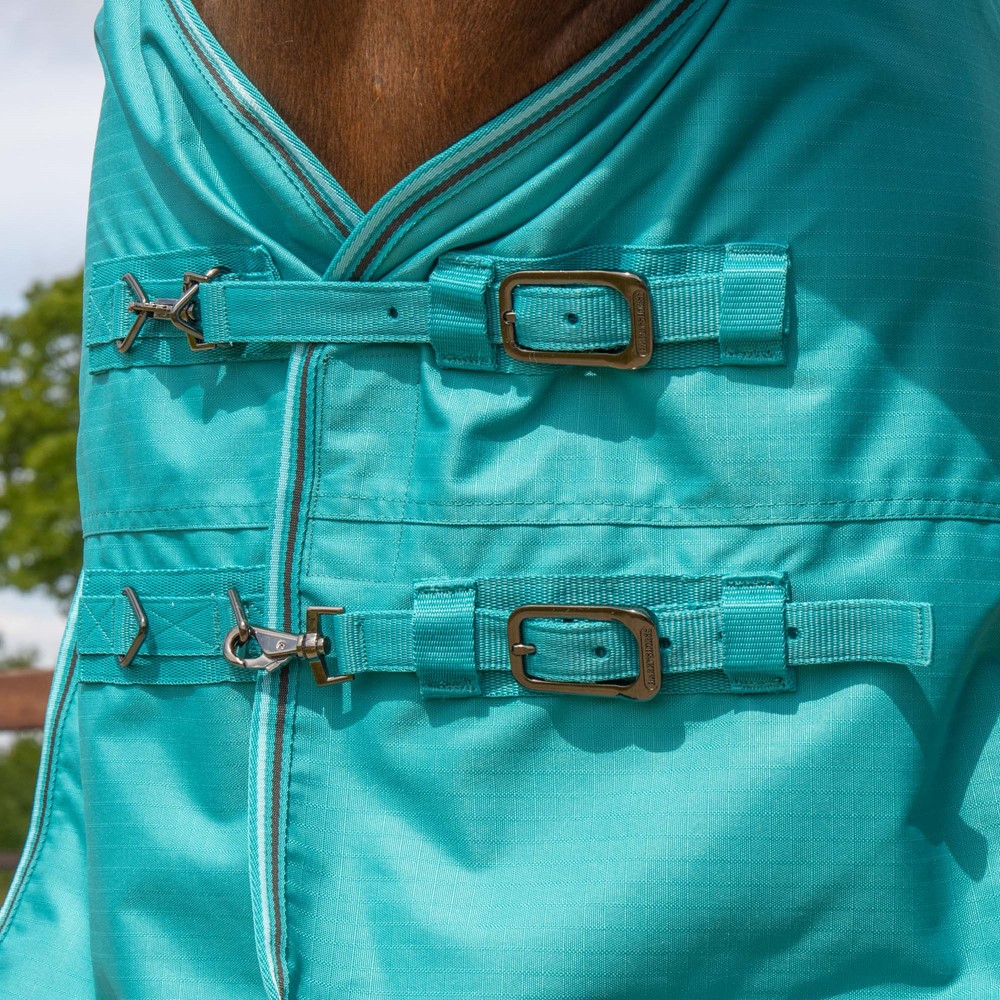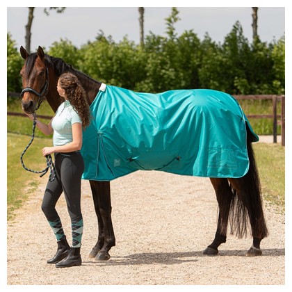 Outdoordecke wasserdicht und atmungsaktiv mit weichem Fleece-Futter. Nahtlos am Rücken und mit doppeltem Schnellverschluss vorne, Schweiflatz, polyestergefüttert an der Brust, Kreuzgurten, getapten Nähten und abnehmbaren elastischen Beinschnüren.