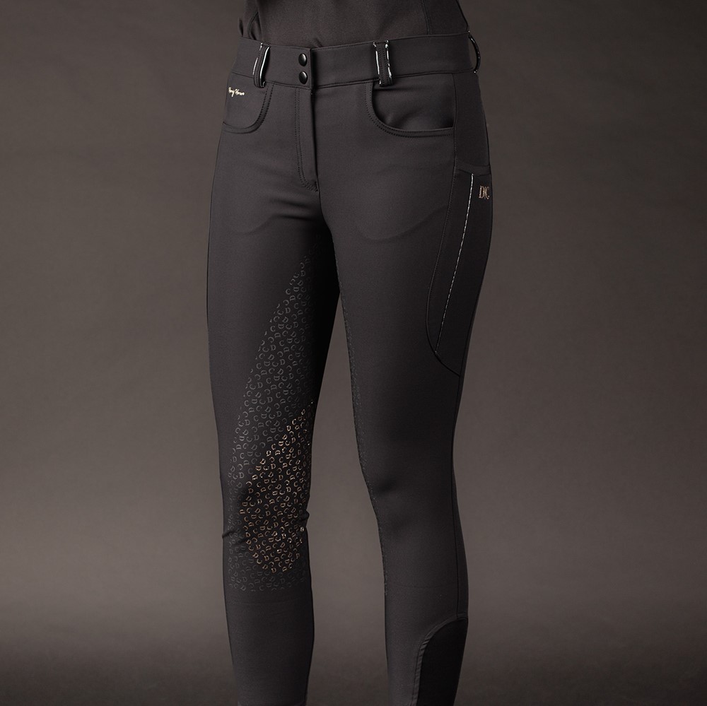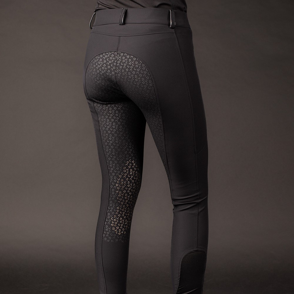 Reithose mit Gürtelschlaufen und dezent glitzernder Paspelierung, zwei Einschubtaschen, eine Handytasche auf der linken Seite mit Glitzerpaspel und glitzerndem Silikonlogo von Denici Cavalli. Ausgestattet mit einem rundgenähten Vollbesatz mit Silikonprint, der an den Knien einen feinen Glitzereffekt aufweist. Elastischer Einsatz am Knöchel für zusätzlichen Komfort in Reitstiefeln.