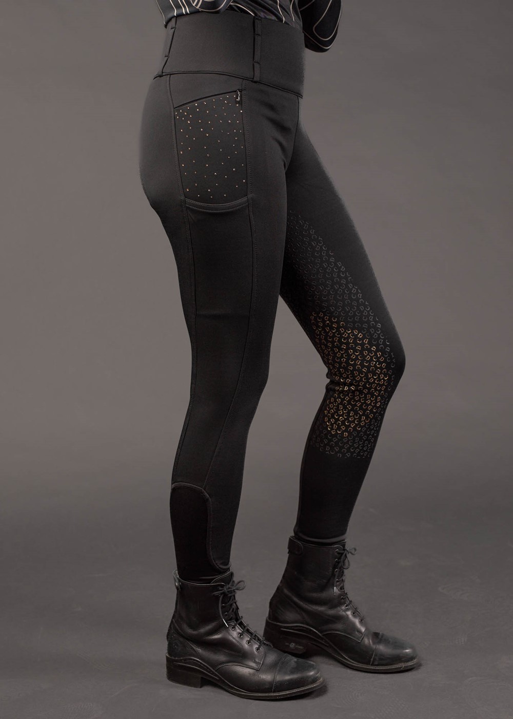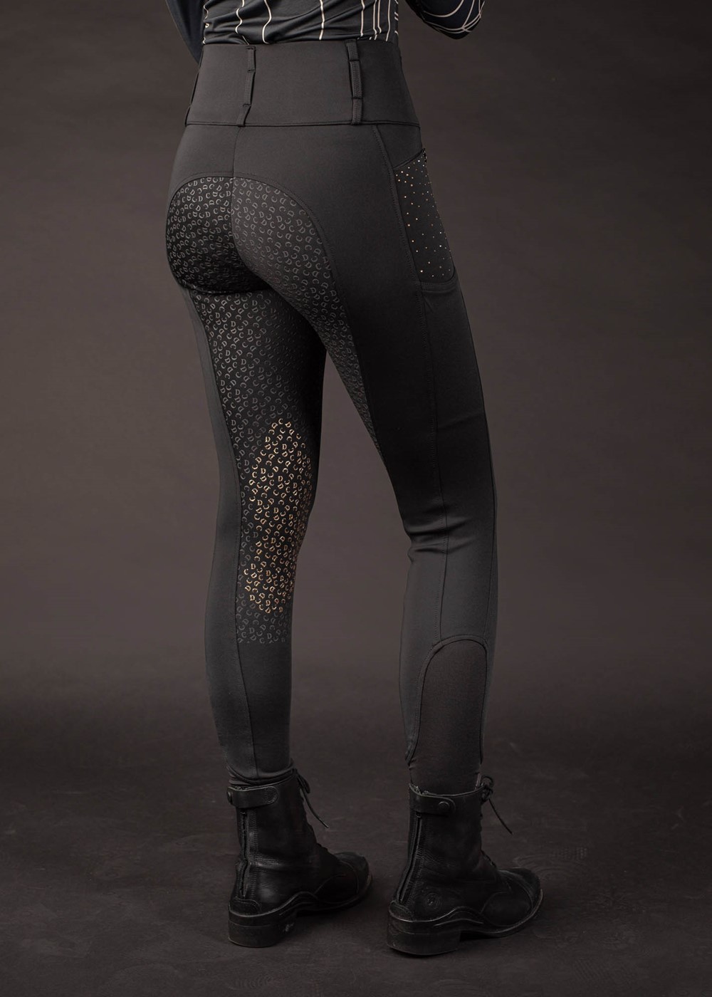 Reitleggings mit hohem Bund und Gürtelschlaufen, abgesteppt für einen schmalen Gürtel. Zwei Reißverschlusstaschen, rechts ein Denici Cavalli-Logo mit Kristallen, links mit Allover-Kristallverzierung. Ausgestattet mit einem rundgenähten Vollbesatz mit Silikonprint, der an den Knien einen dezenten Glitzereffekt aufweist. Elastischer Einsatz am Knöchel für zusätzlichen Komfort in Reitstiefeln.