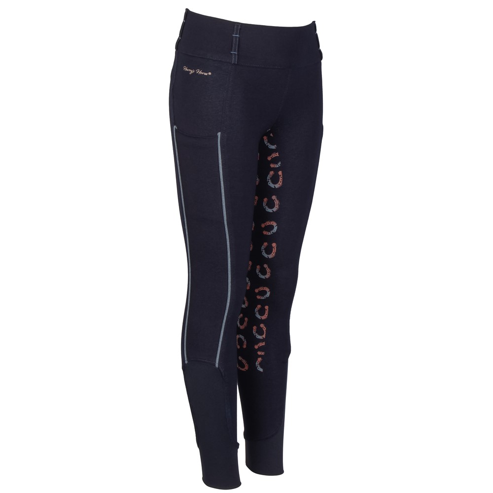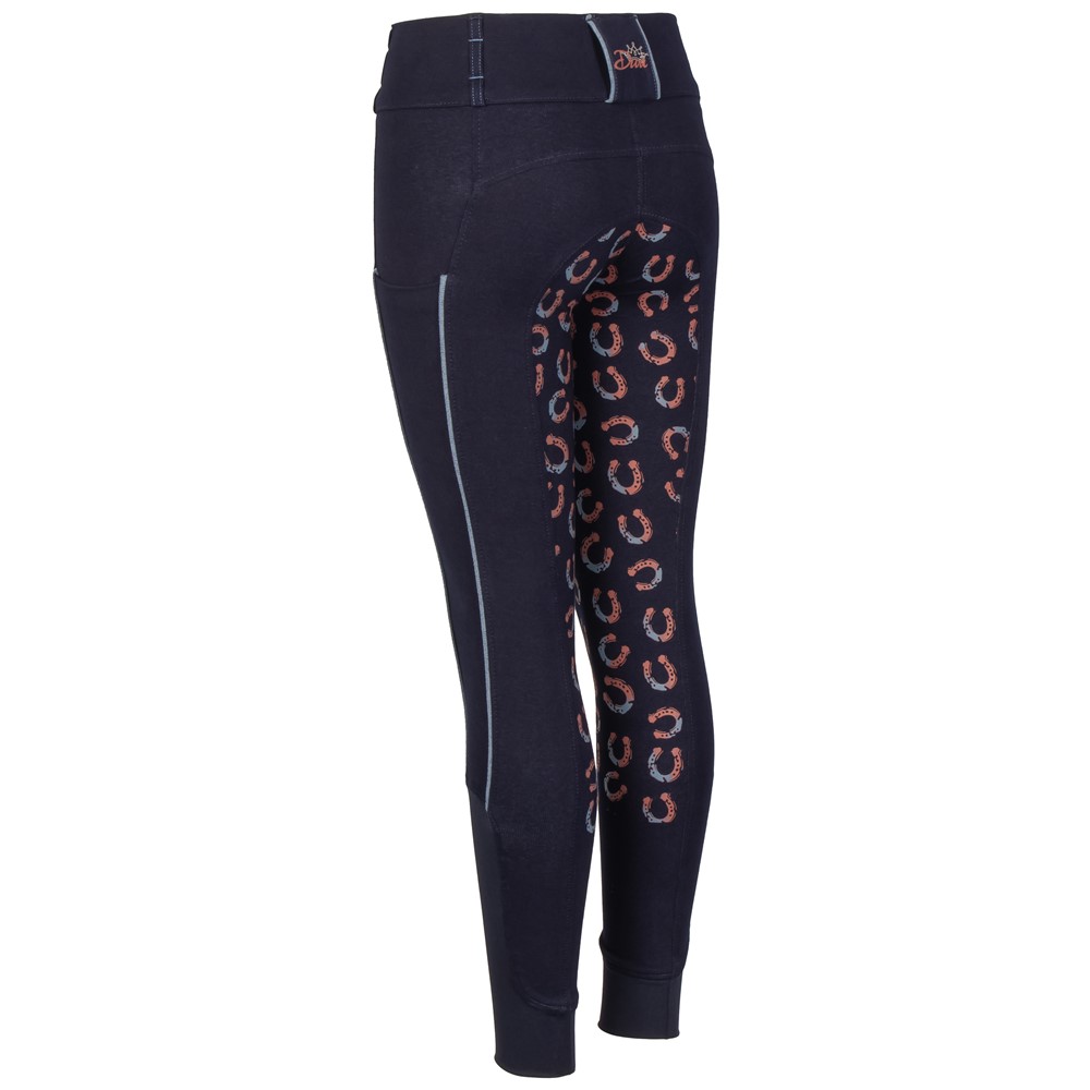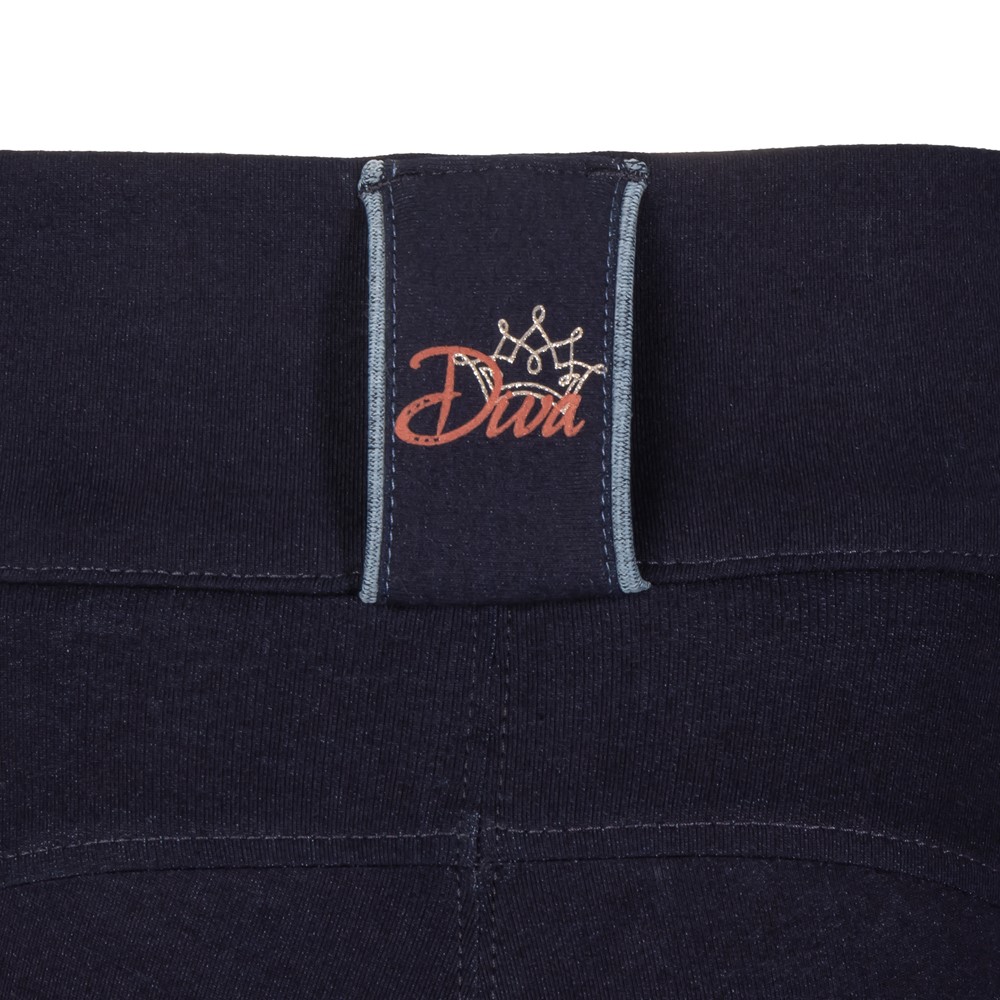 Reitleggings in Denim-Optik mit rundgenähtem Vollbesatz, ausgestattet mit Silikon-Grip in Hufeisen-Gradient-Print für zusätzliche Stabilität im Sattel. Die Leggings verfügt über zwei seitliche Taschen mit Paspeldetails, die bis zu den komfortablen elastischen Einsätzen an den Knöcheln verlaufen. Der Bund ist mit Gürtelschlaufen versehen und auf der Rückseite befindet sich das Diva-Logo.