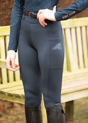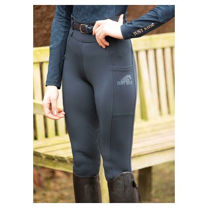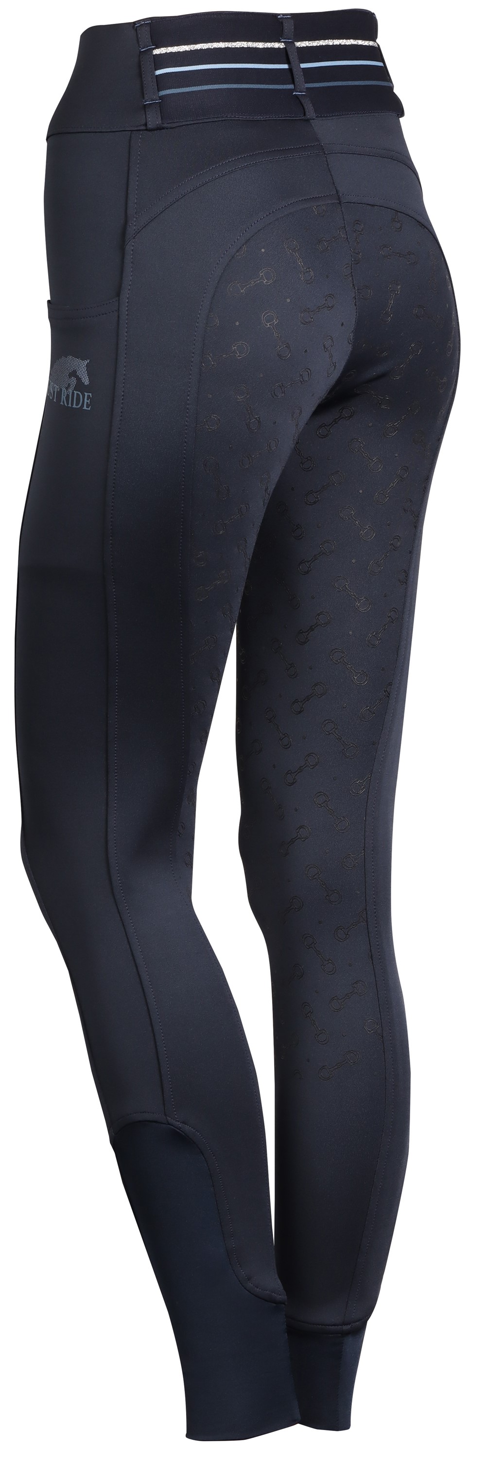 Reitleggings mit zwei Reißverschlusstaschen und einem "Just Ride"-Print auf der linken Seite. Die Hose hat einen breiten Bund mit Gürtelschlaufen und Streifendetails auf der Rückseite, einen rundgenähten Sitzbereich mit Silikonprint für zusätzlichen Halt im Sattel und einen elastischen Einsatz an den Knöcheln für mehr Komfort in Reitstiefeln.