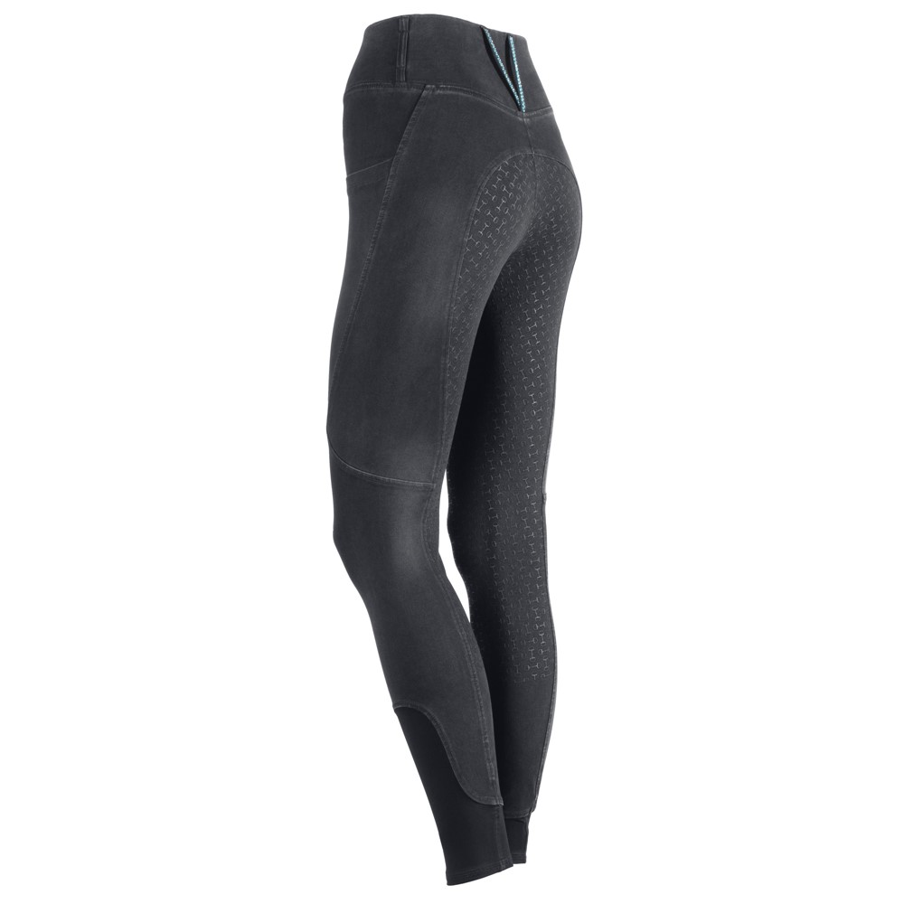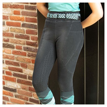 Sportliche Reitleggings im Denim-Look mit breitem Bund, ausgestattet mit Gürtelschlaufen. Die langen Gürtelschlaufen auf der Rückseite sind mit funkelnden Kristallen verziert. Zwei Seitentaschen, ein rundgenähter Sitzbereich mit feinem Silikon-Allover-Print im Gebiss-Design für zusätzlichen Halt im Sattel. Mit einem komfortablen elastischen Einsatz rund um die Knöchel.