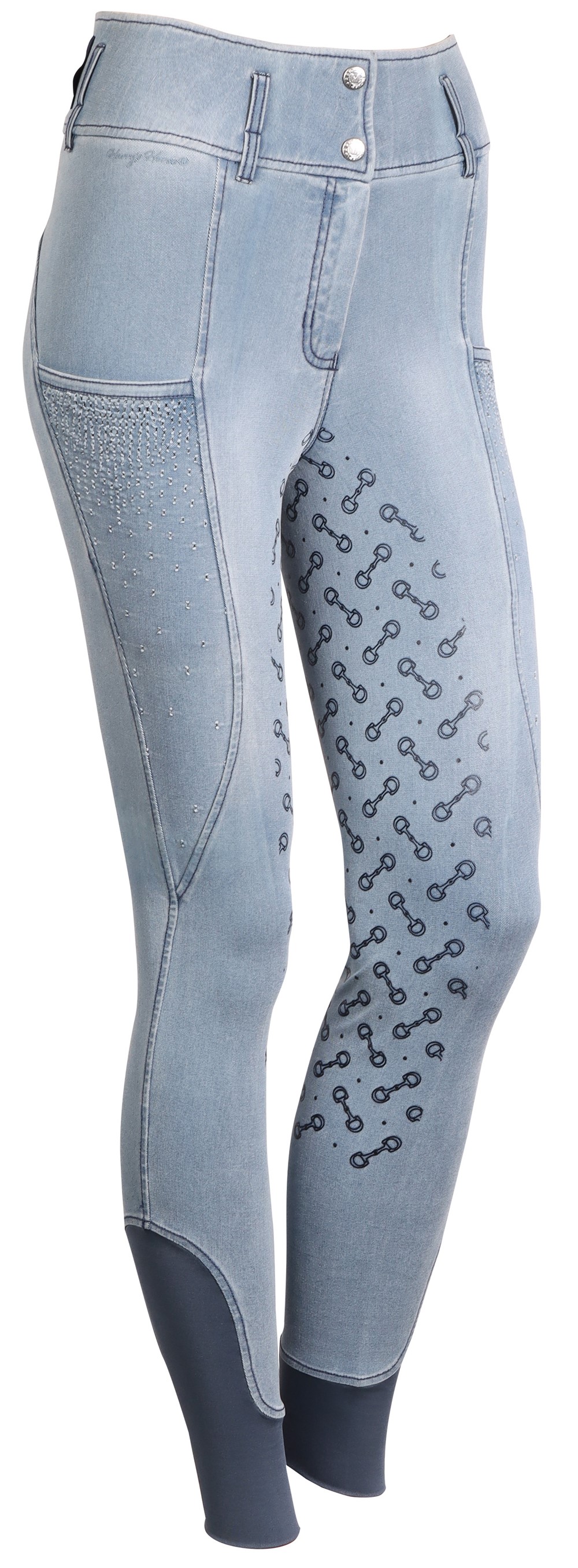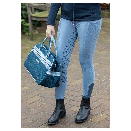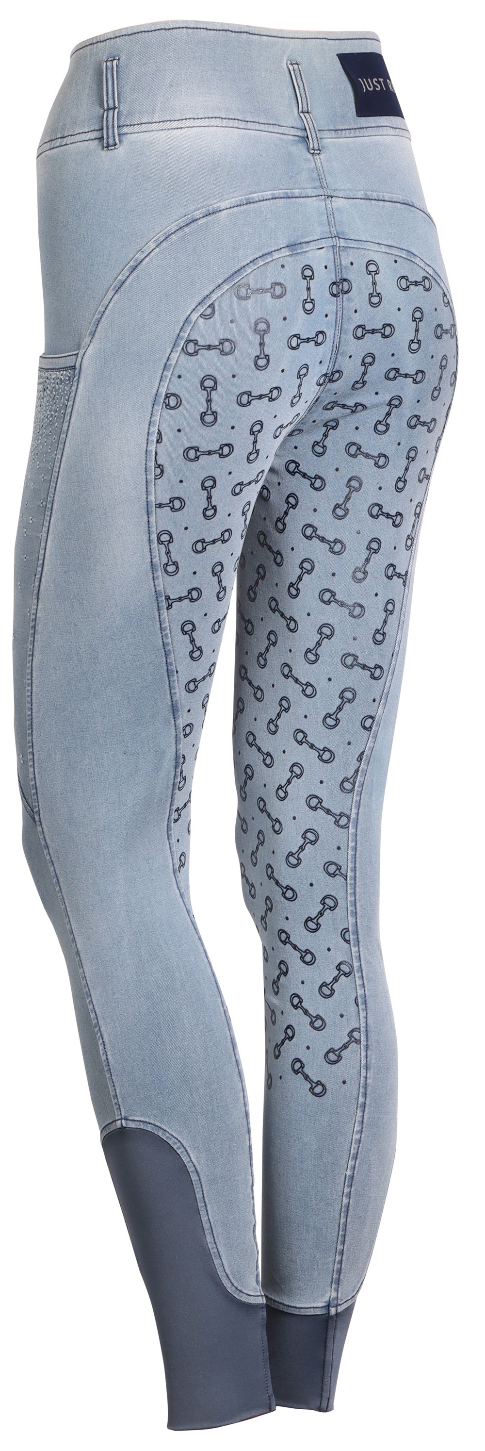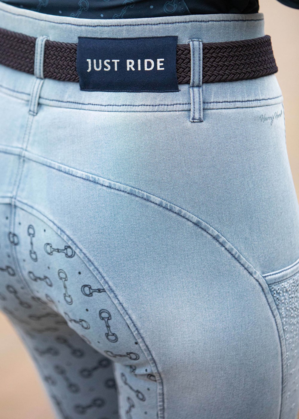 Reitleggings aus Stretch-Denim-Material mit zwei Einschubtaschen mit Lasercut-Details, einem breiten Bund mit Gürtelschlaufen und einem "Just Ride"-Abzeichen auf der Rückseite. Der rundgenähte Sitzbereich ist mit einem Silikonprint versehen, der zusätzlichen Halt im Sattel bietet. Ein elastischer Einsatz an den Knöcheln sorgt für mehr Komfort in Reitstiefeln.