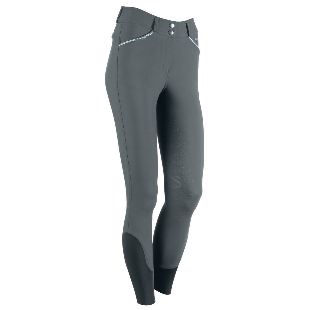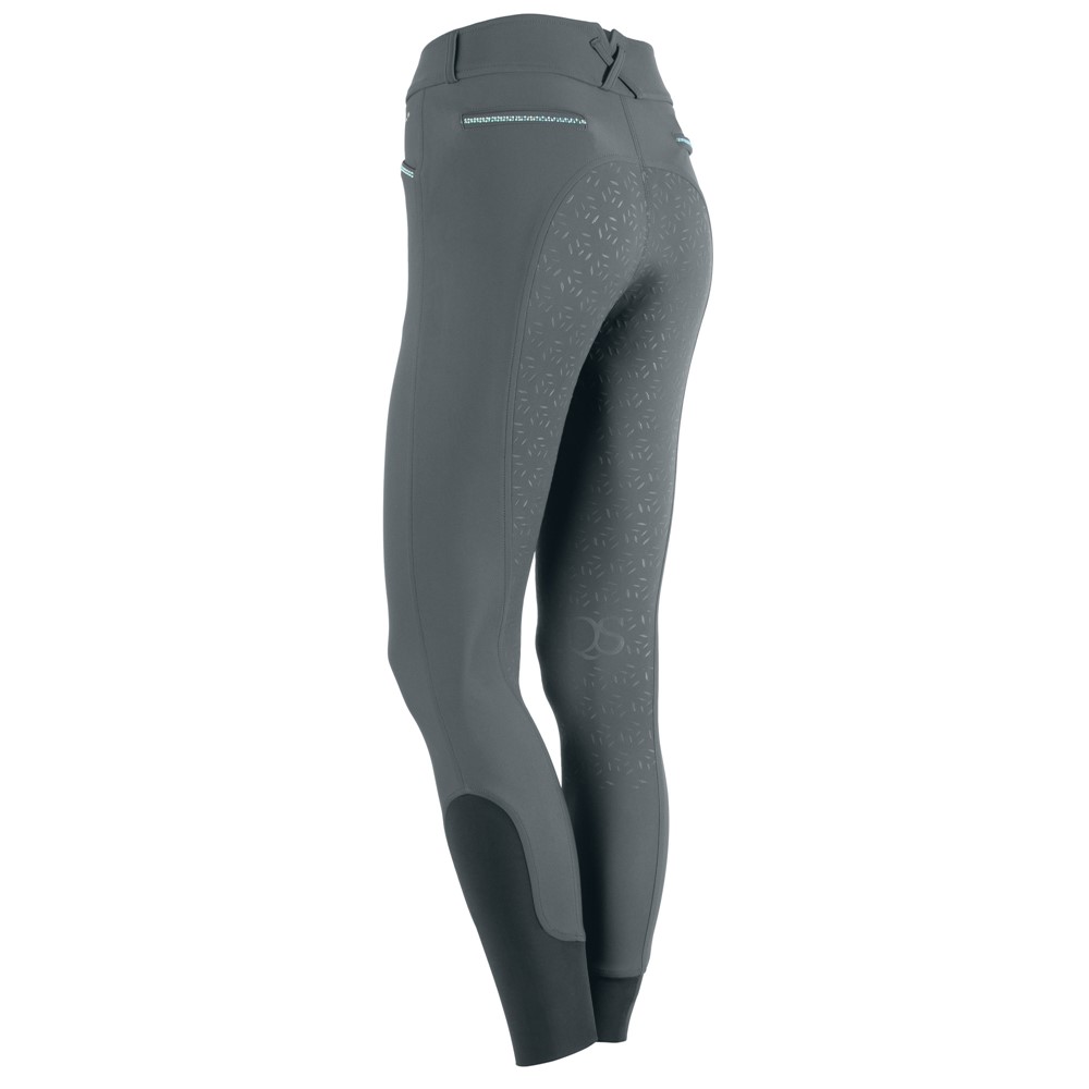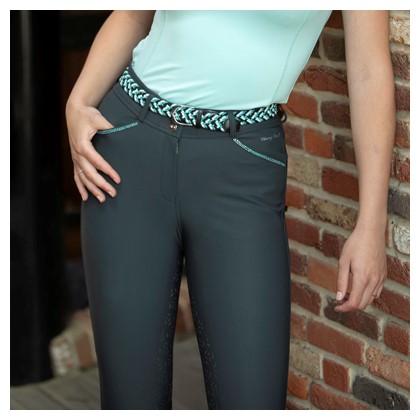 Elegante Reithose aus Nylon, mit breitem Bund und V-förmigem Ausschnitt hinten in der Mitte. Ausgestattet mit Gürtelschlaufen, Eingrifftaschen und angedeuteten Gesäßtaschen mit Kristallen. Rundgenähter Sitzbereich mit Silikonprint für zusätzlichen Halt im Sattel. Mit einem komfortablen elastischen Einsatz rund um die Knöchel.