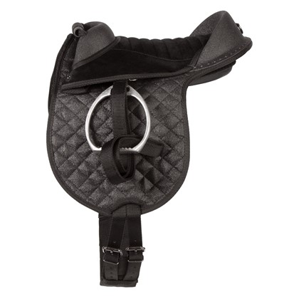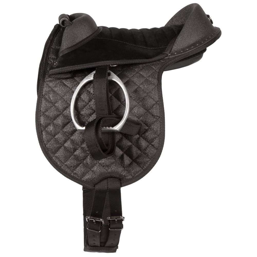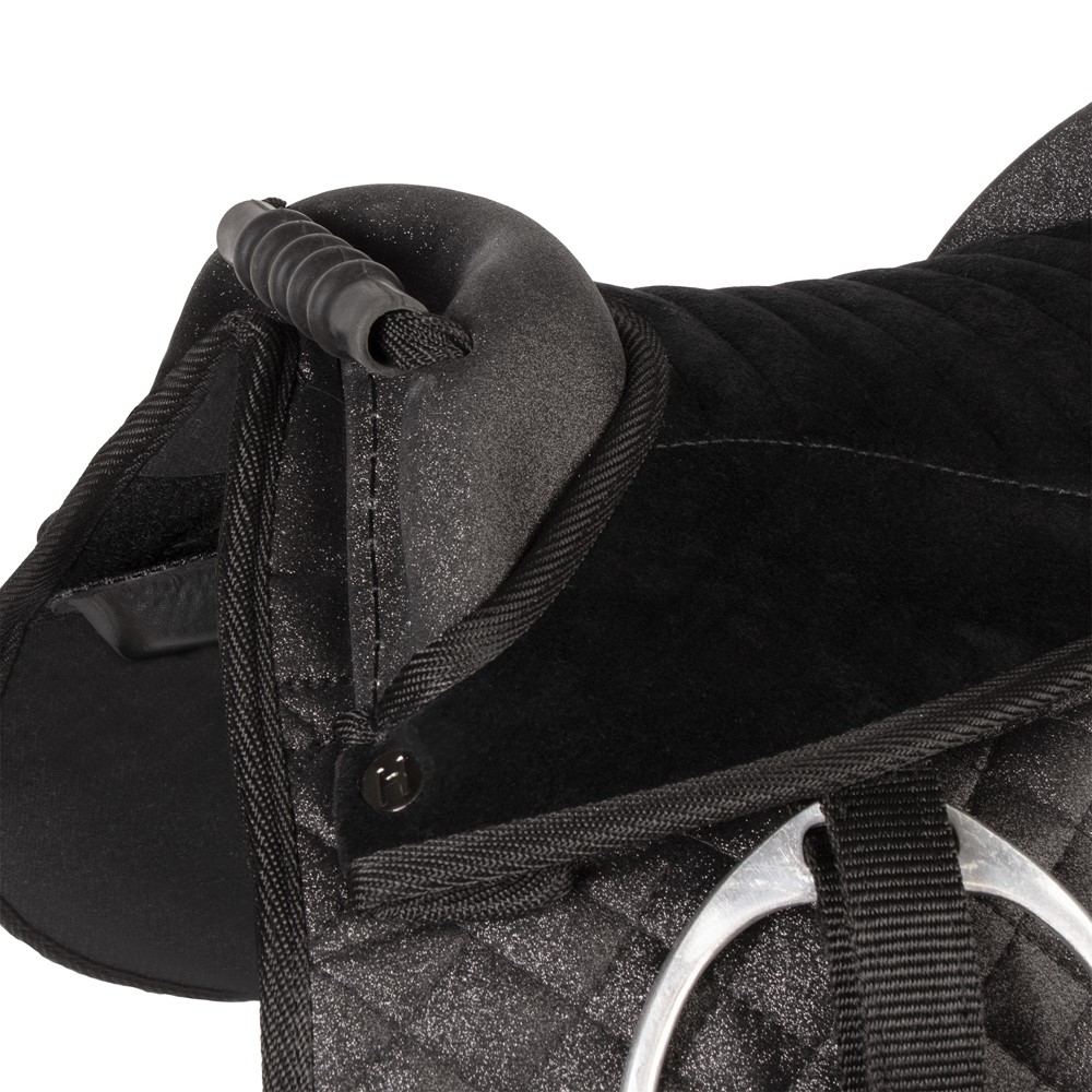 Leichtgewicht-Ponysattel für junge Reiter, ausgestattet mit einem Haltegriff und D-Ringen zur Befestigung eines Schweifriemens. Der Sattel ist aus robustem Kunststoff gefertigt und dadurch pflegeleicht. Er ist mit dezenten Glitzerdetails versehen.