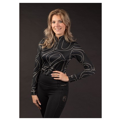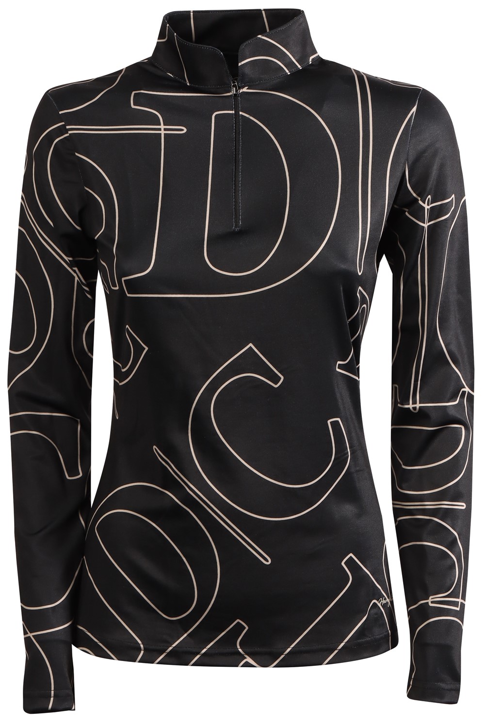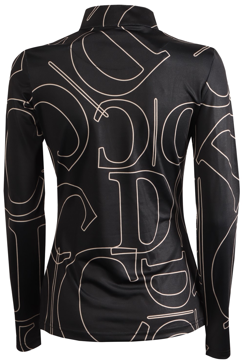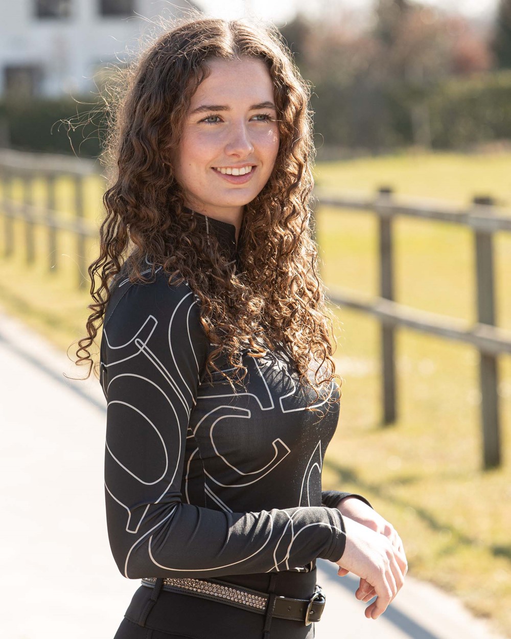 Langarmshirt mit Stehkragen, der rund zur kurzen Reißverschlussöffnung verläuft. Großflächiger, zufällig platzierter Denici Cavalli Allover-Print auf dem gesamten Shirt – jedes Teil ist dadurch ein Unikat.