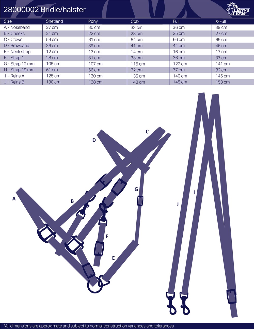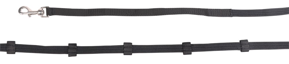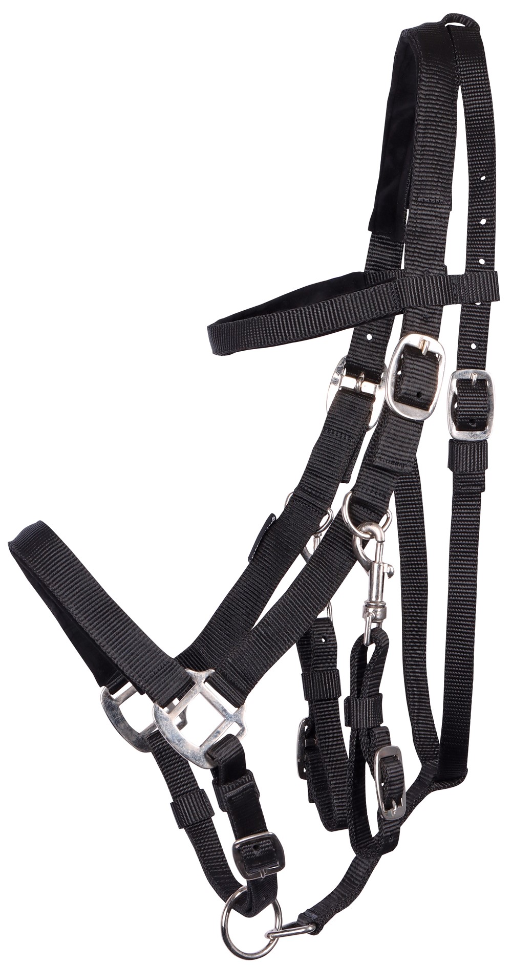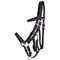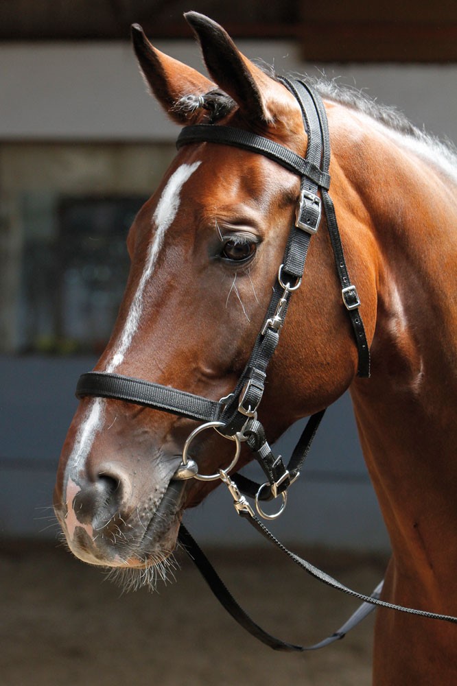 Schwarze PP-Trense mit schwarzem Domy-Wildlederpolster und silberfarbenen Beschlägen. Gebissstück lässt sich einfach mit Drehkarabinerhaken entfernen, so dass nur das Halfter übrig bleibt. Mit Gurtbandzügeln.