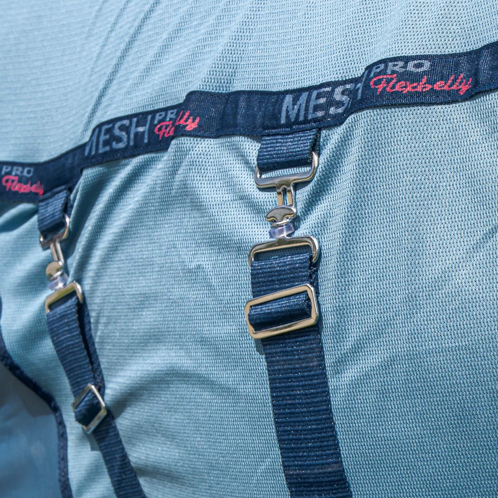 Mesh-Pro-Pferdedecke, verwendbar als Fliegendecke oder Kühldecke, ausgestattet mit doppeltem Frontverschluss, festem Halsteil mit drei Verschlüssen und einer Fütterung zum Schutz der Mähne. Zudem mit Bauchlatz, extra breiter Schweiflatz, Schweifriemen und polyestergefüttertem Brustbereich.