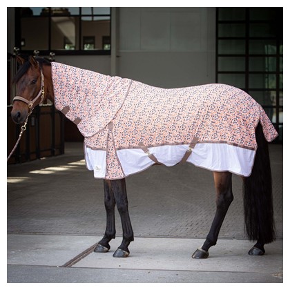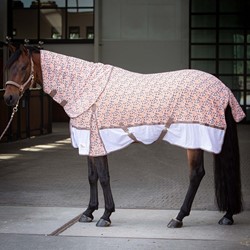 Mesh-Pro-Pferdedecke, verwendbar als Fliegendecke oder Kühldecke. Ausgestattet mit doppeltem Frontverschluss, abnehmbarem Halsteil mit drei Verschlüssen und einer Fütterung zum Schutz der Mähne, Kreuzgurten, Schweiflatz und Schweifriemen. Der Brustbereich ist mit Polyester gefüttert.