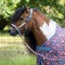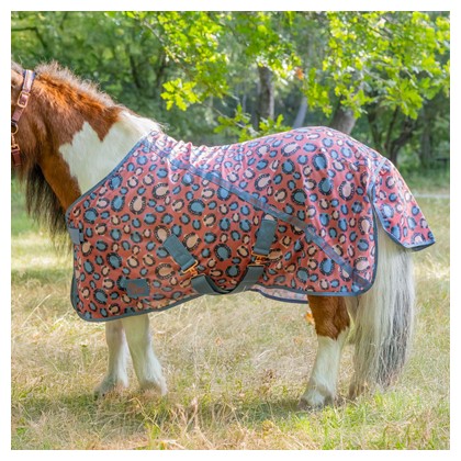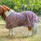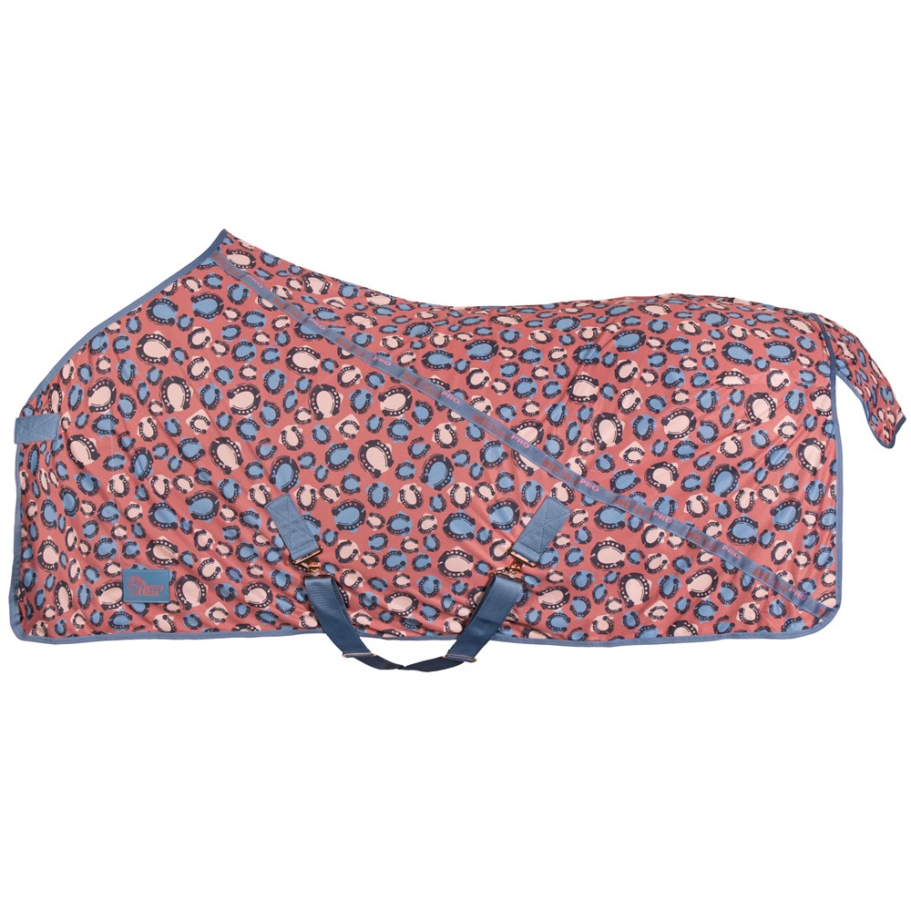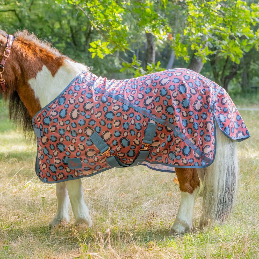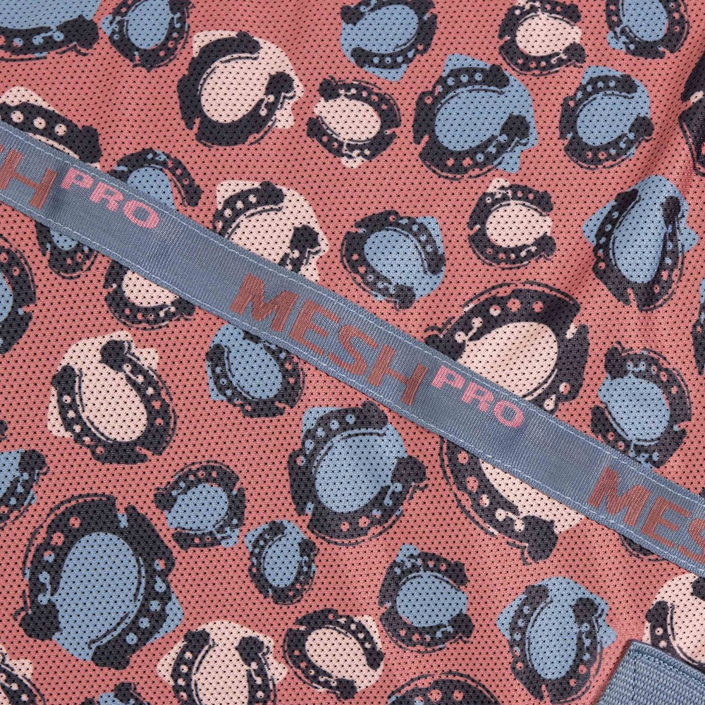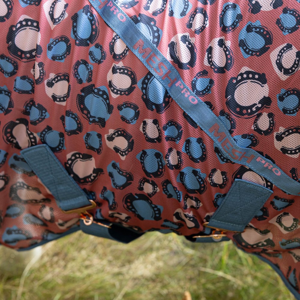 Schöne Mesh-Fliegendecke mit Allover-Hufeisen-Print, verwendbar als Fliegendecke oder als Abschwitzdecke. Mit einfachem Klettverschluss vorne, Kreuzgurten und Schweifkordel. Der Brustbereich ist mit Nylon gefüttert, um Scheuern zu vermeiden.