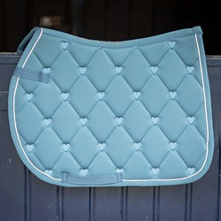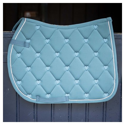 Schabracke mit herzförmiger Allover-Steppung und rosa Paspel rundum, ausgestattet mit Coolmesh-Futter, Gurtschlaufen und Sattelgurtschlaufen.