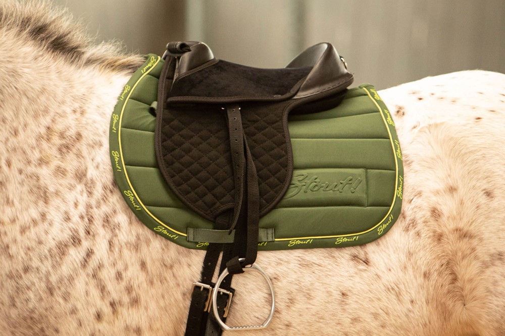 Sportliche Schabracke mit STOUT!-Logo auf der linken Seite und auf der Einfassung sowie mit einer kontrastierenden Zierkordel.