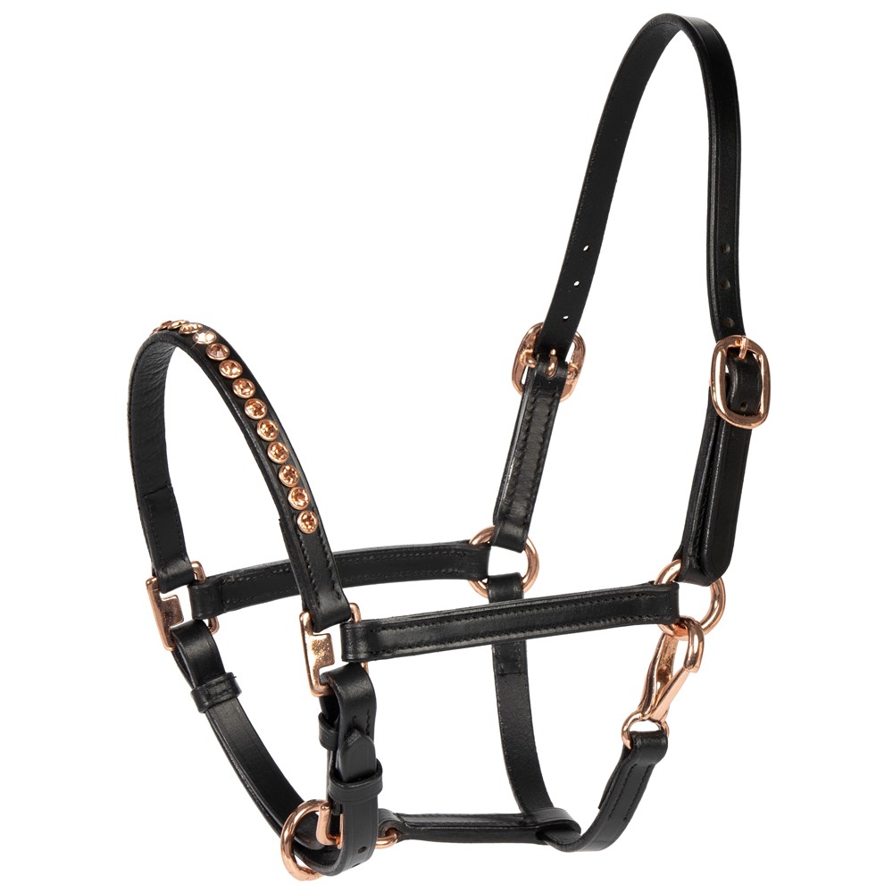 Luxury leather halter, decorated with rose gold-coloured crystals on the noseband for an elegant look. The halter is adjustable on both sides of the headpiece and under the chin for an optimal fit. Finished with matching rose gold-coloured hardware.