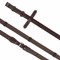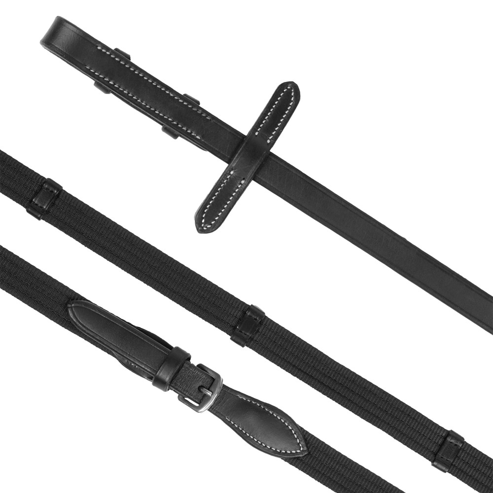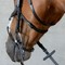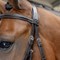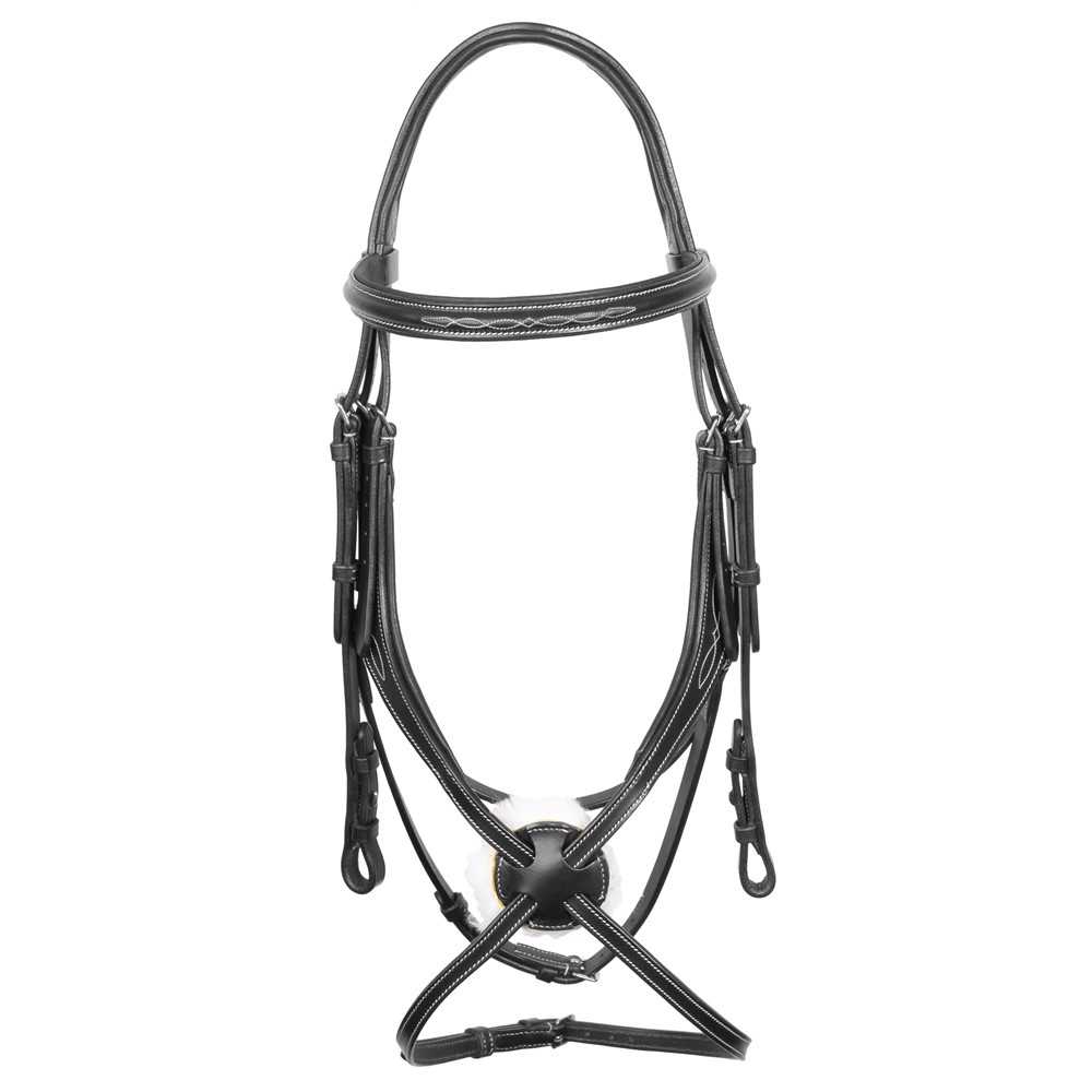 Leather bridle with anatomically shaped Mexican noseband and anatomical headpiece. Features soft padding and contrast stitching on the headpiece, browband, and noseband, with extra soft padding underneath the center of the noseband.