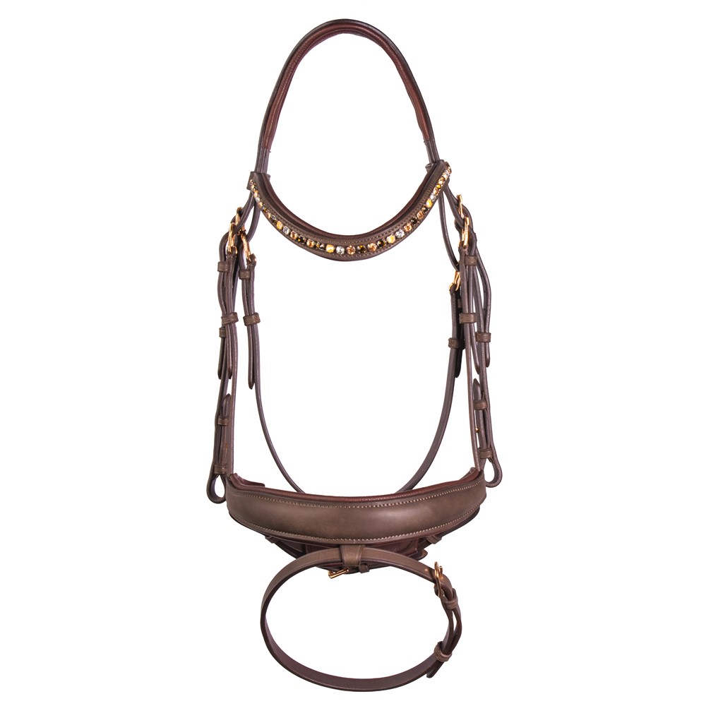 Comfortable and soft leather bridle, featuring an anatomically shaped headpiece and matching anatomical flash noseband. The browband is adorned with crystals in four different colours and finished with rose gold coloured fittings. Comes complete with reins with concealed closures.