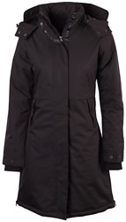 Waterproof long coat with hood, zippered back slit with a fabric insert behind it to keep you dry while riding. Ribbed wind cuffs in the sleeves. Inside pocket with a headphone cord opening. Finished with taped seams and a hanging loop.