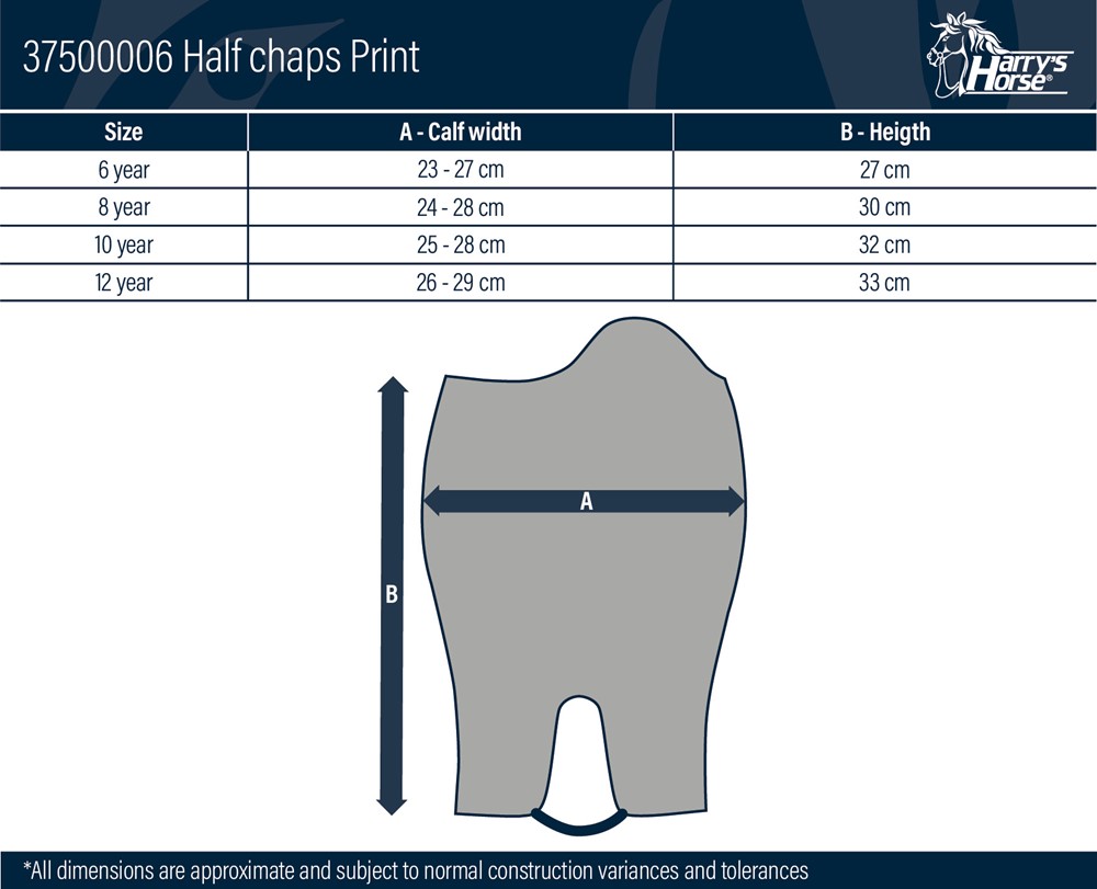 Amara mini chap with elastic calf section and zipper on the outside. The mini chap has a nice print with a crown, a horseshoe and a clover.