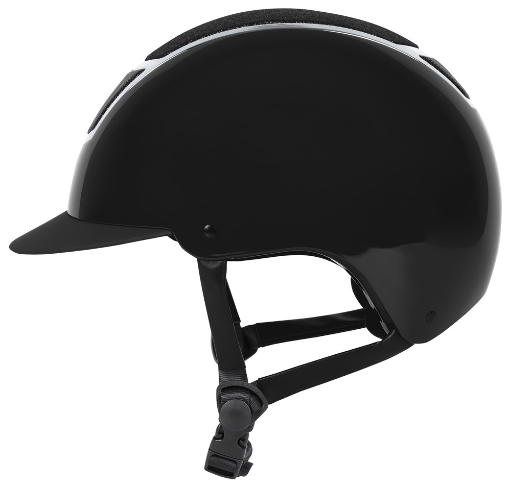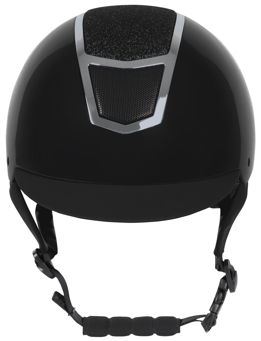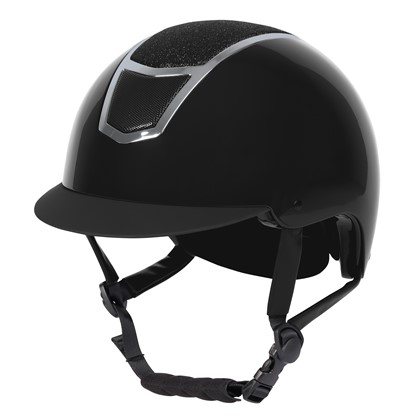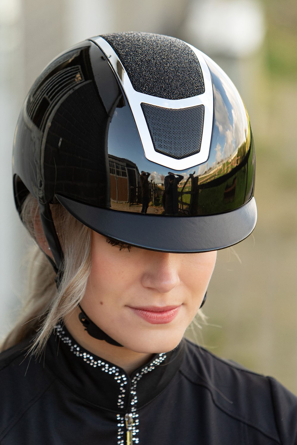 With removable and washable lining. Easily adjustable to size using a dial. Also equipped with multiple ventilation slots. The outer shell has a high-gloss finish, and the middle strip is adorned with crystals.