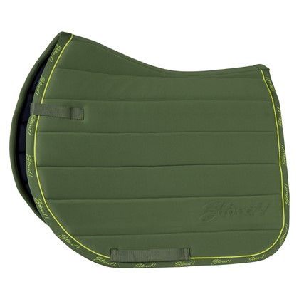Tapis de selle sportif avec logo STOUT! sur le côté gauche et sur le bord, agrémenté d’un cordon décoratif contrastant.