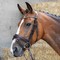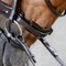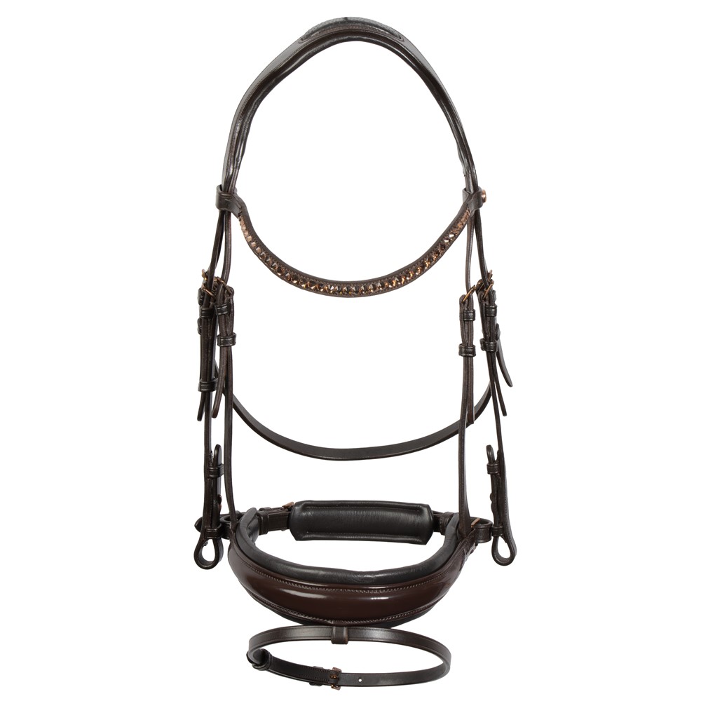 Bridon en cuir avec têtière anatomique et rembourrée pour plus de confort. Équipé d’une muserolle vernie et de boucleries couleur cuivre.