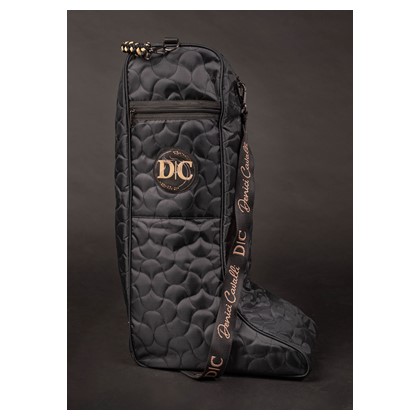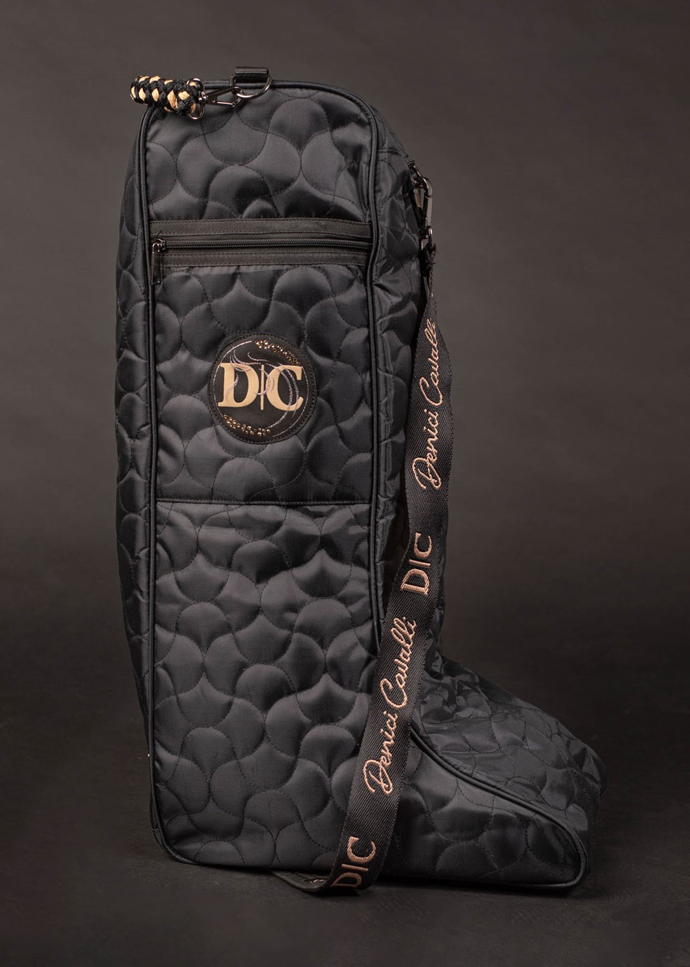 Sac à bottes avec matelassage en all-over, logo Denici Cavalli orné de cristaux, poche extérieure zippée, poignée confortable noir/beige, bandoulière réglable avec logo Denici Cavalli, cloison intérieure en tissu et picots en plastique sous le sac.