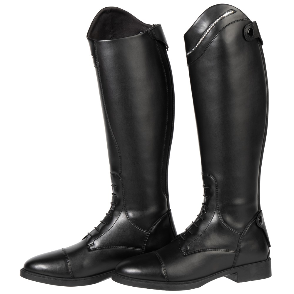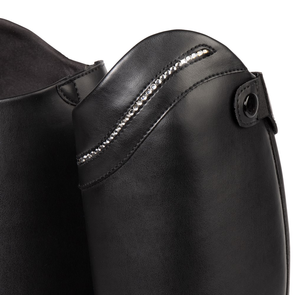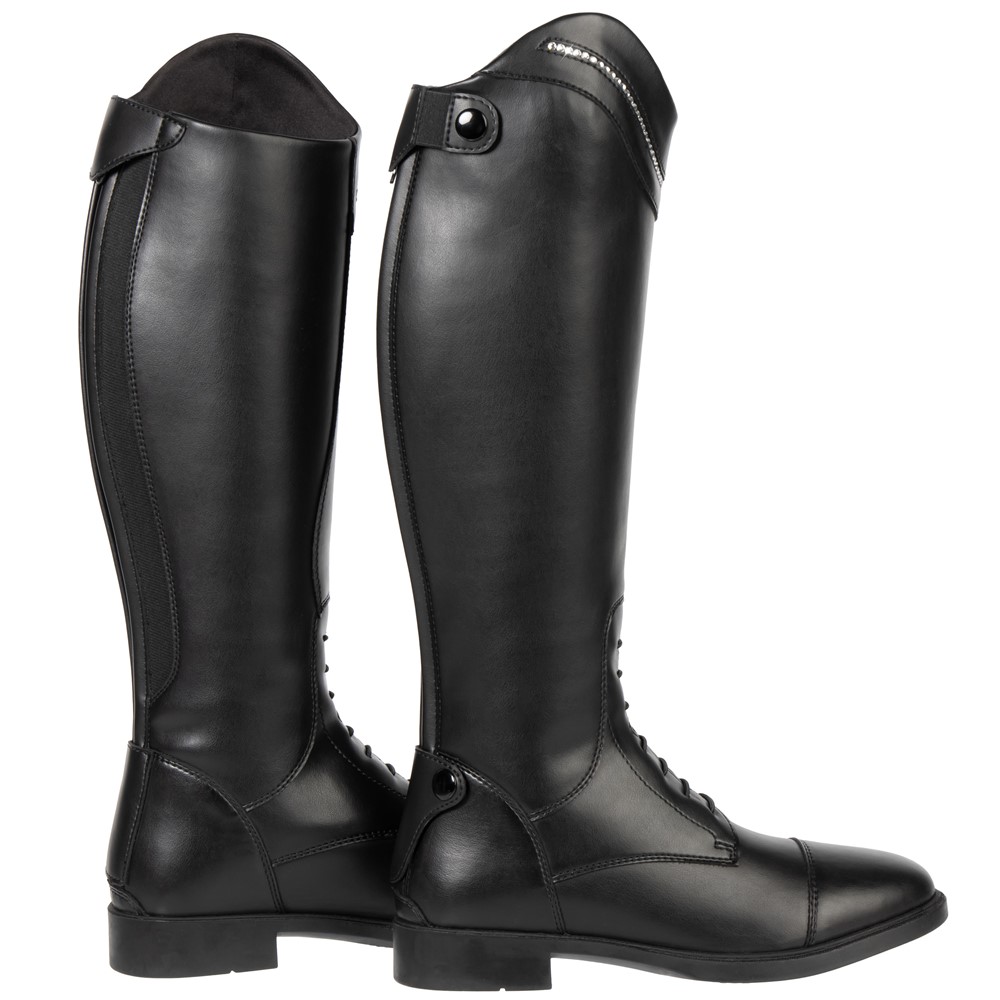 Botte d’équitation en cuir synthétique avec fermeture éclair à l’arrière. La fermeture est protégée en haut et en bas par un rabat avec bouton-pression. Dotée d’un laçage élastique à l’avant, d’un insert élastique au mollet pour un ajustement optimal et d’une décoration en cristaux près du genou.