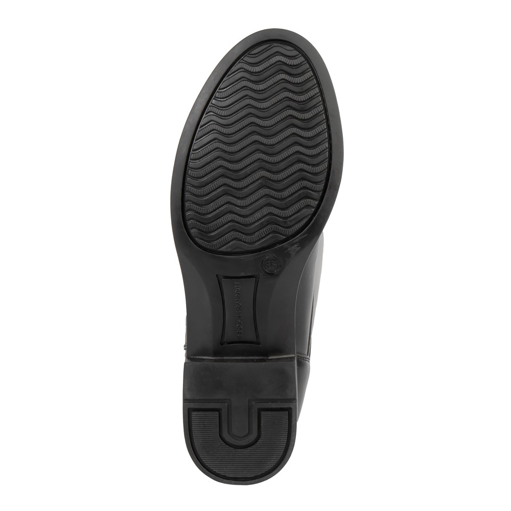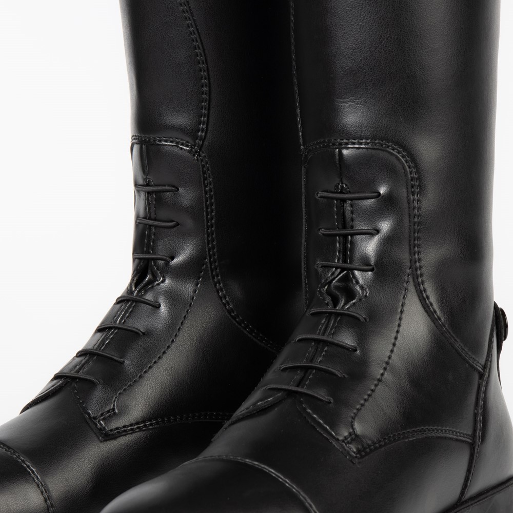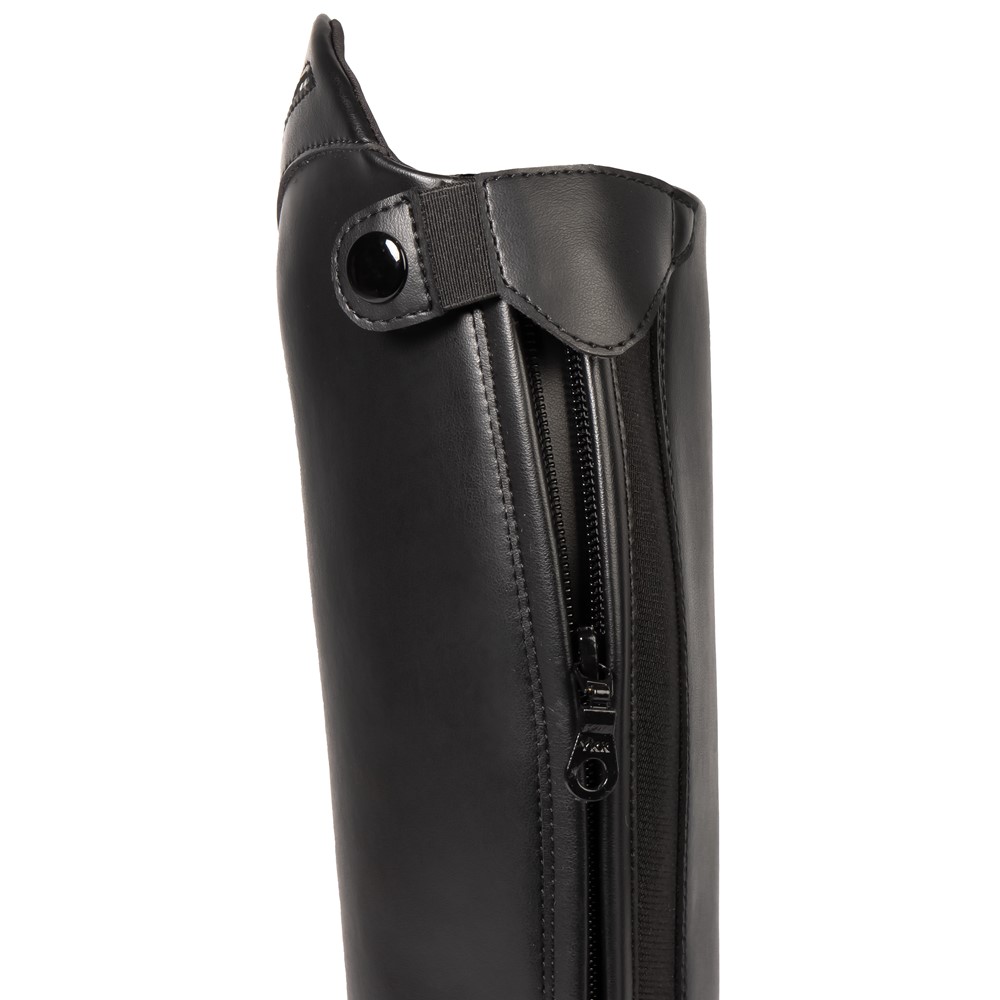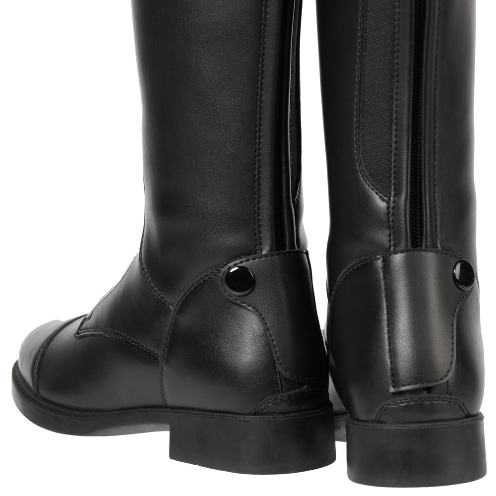 Botte d’équitation en cuir synthétique avec fermeture éclair à l’arrière. La fermeture est protégée en haut et en bas par un rabat avec bouton-pression. Dotée d’un laçage élastique à l’avant, d’un insert élastique au mollet pour un ajustement optimal et d’une décoration en cristaux près du genou.