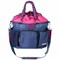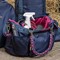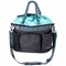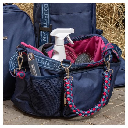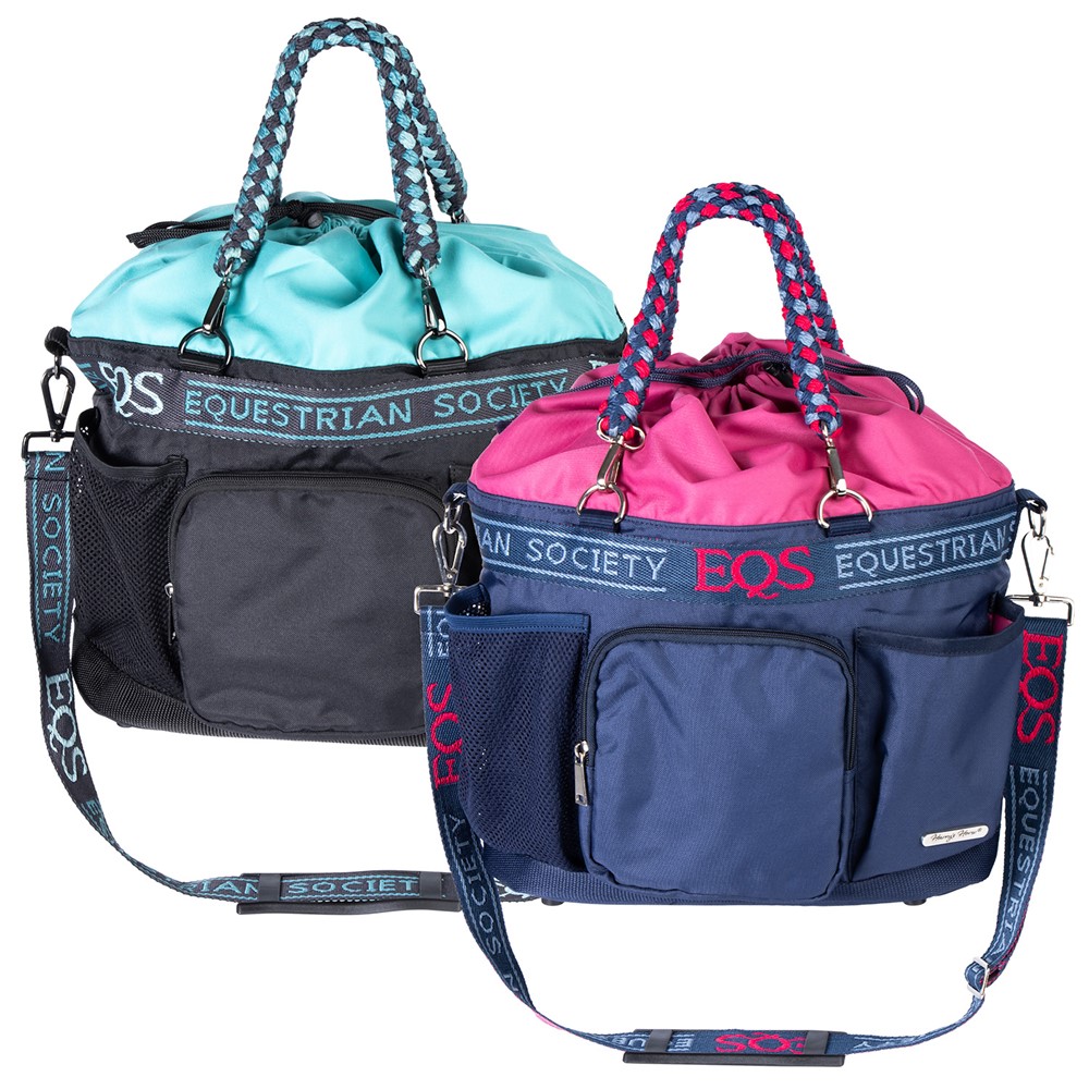 Sac de pansage avec sangle tout autour portant le logo EQS, dessus contrasté avec fermeture à cordon multicolore. Trois poches extérieures, dont une zippée. Poignées originales façon longe multicolore, bandoulière réglable avec logo EQS, picots de protection en plastique sous le sac.