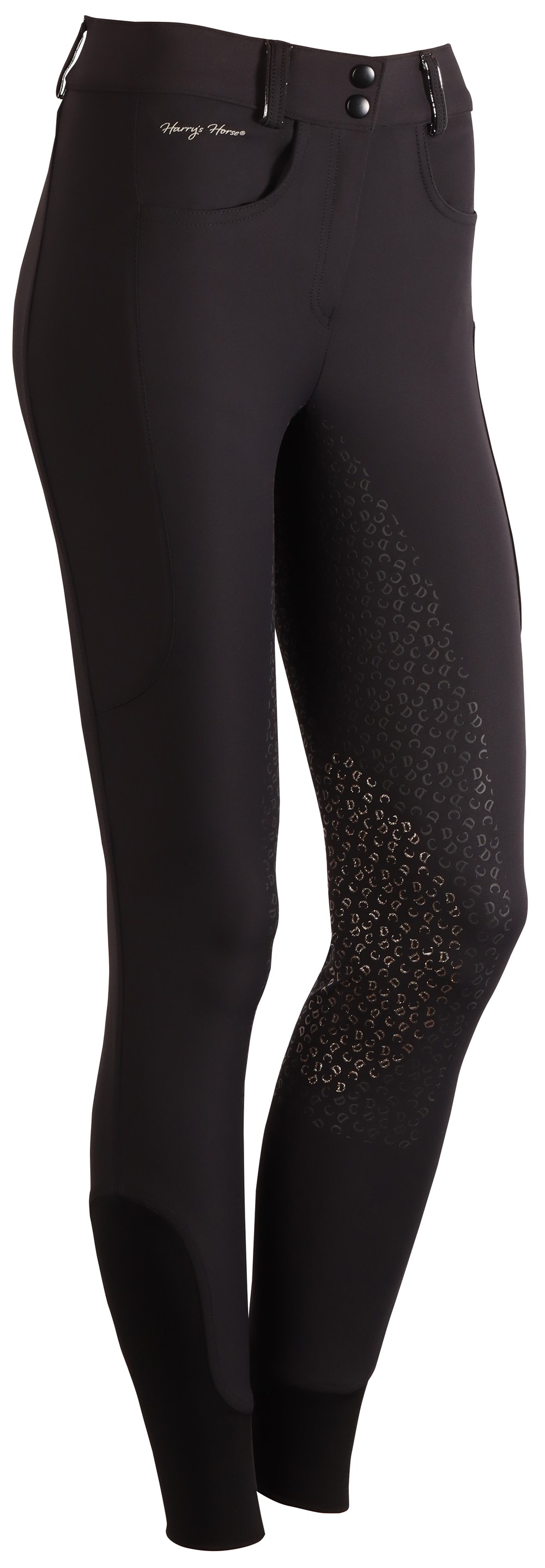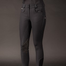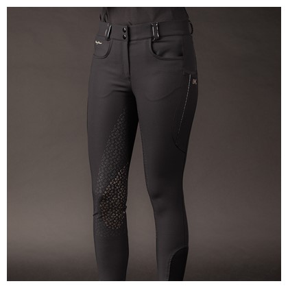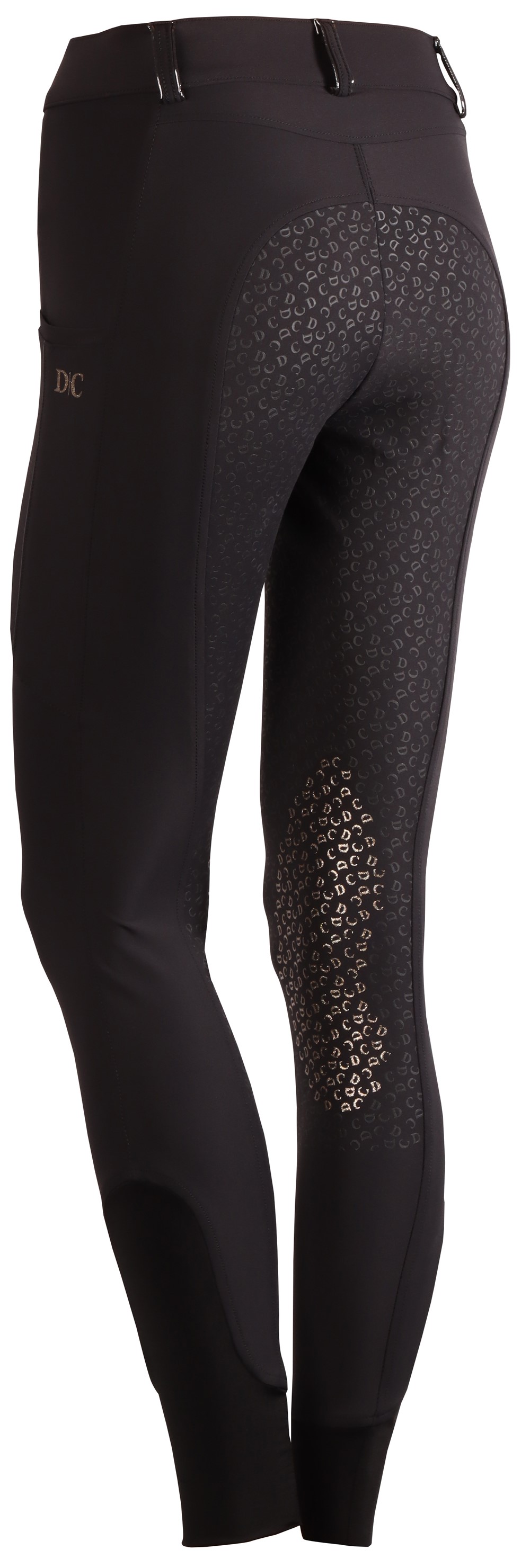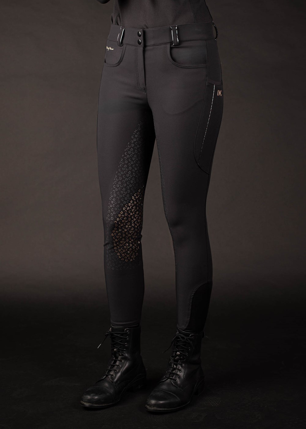 Pantalon d’équitation avec passants de ceinture ornés d’un passepoil à paillettes discret, deux poches fendues, une poche pour téléphone sur le côté gauche avec passepoil pailleté et logo Denici Cavalli en silicone pailleté. Doté d’un fond intégral cousu avec impression en silicone, incluant un effet pailleté subtil au niveau des genoux. Empiècement élastique autour de la cheville pour plus de confort dans les bottes d’équitation.