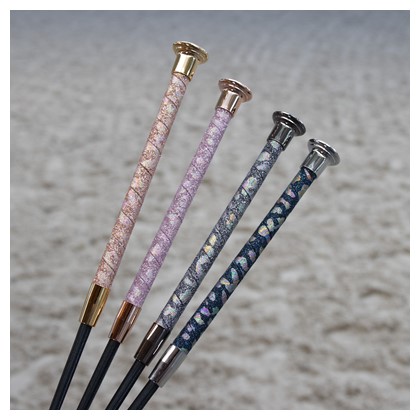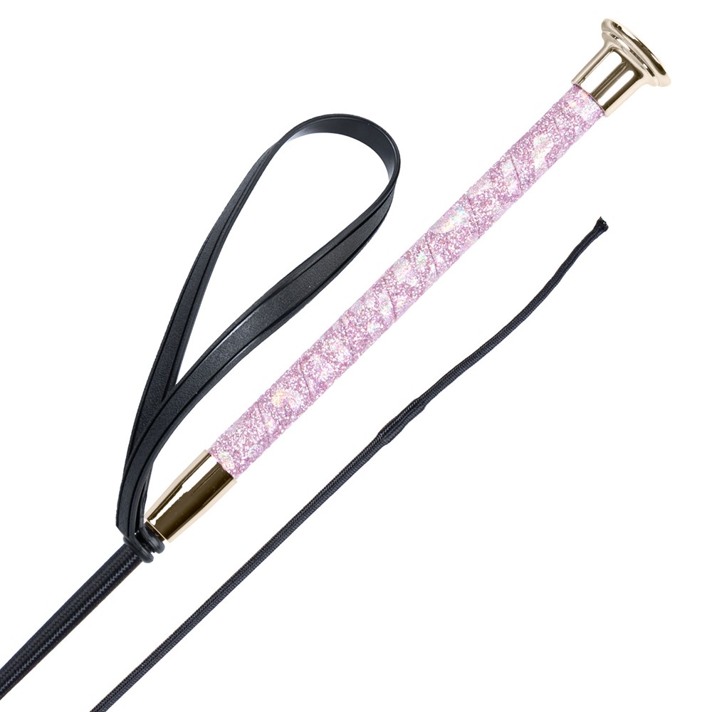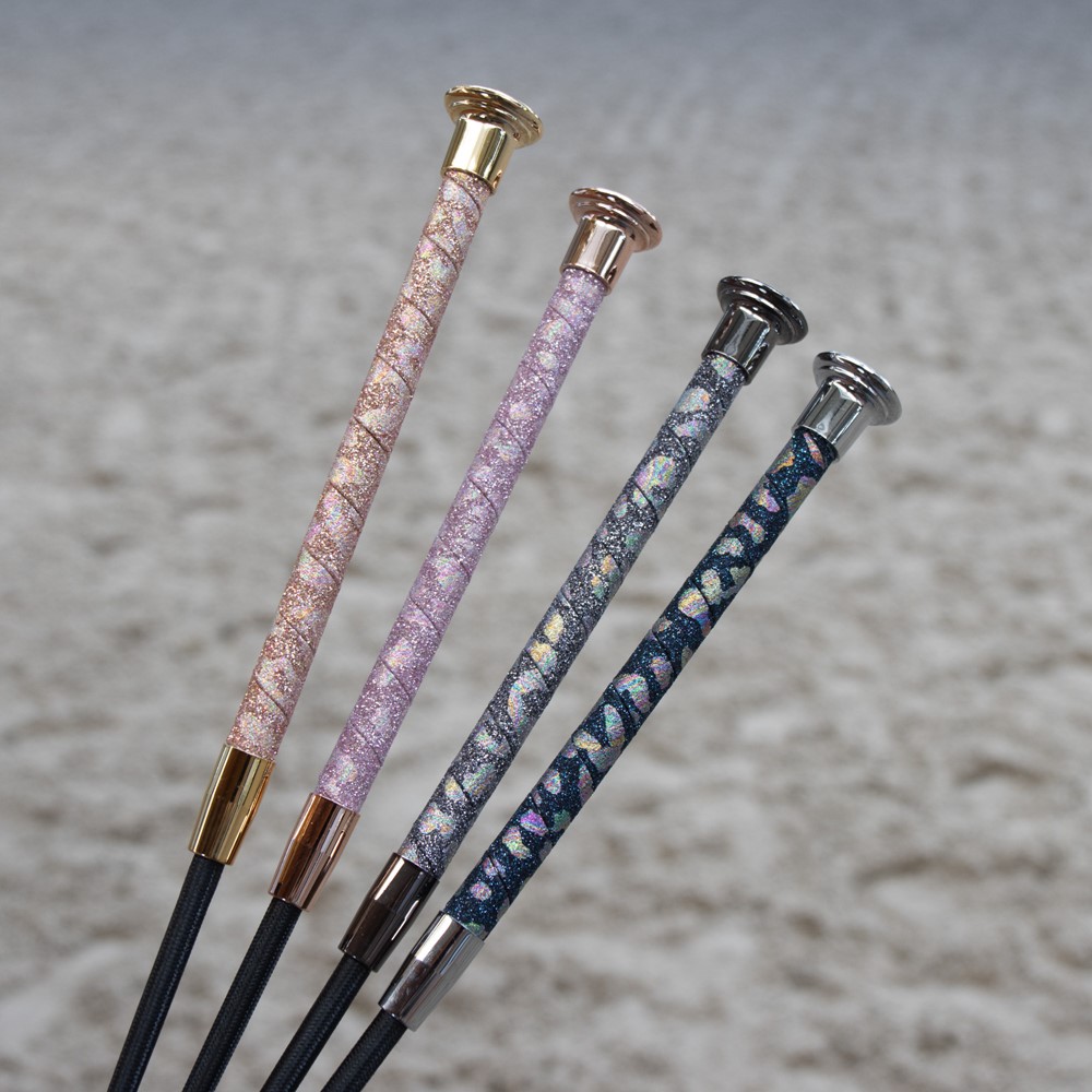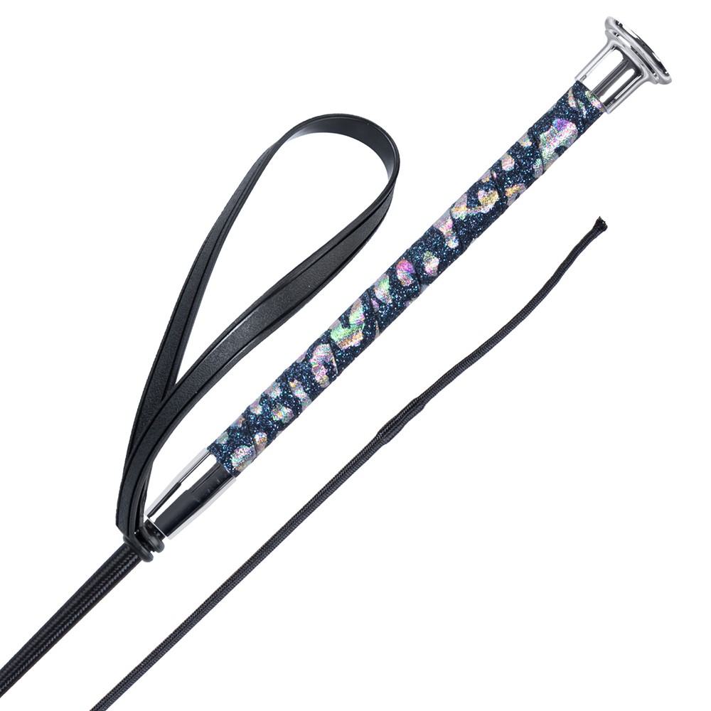 Cravache avec poignée à imprimé léopard pailleté coloré et dragonne.