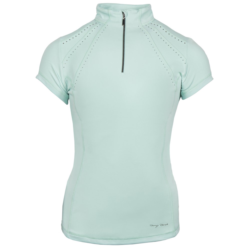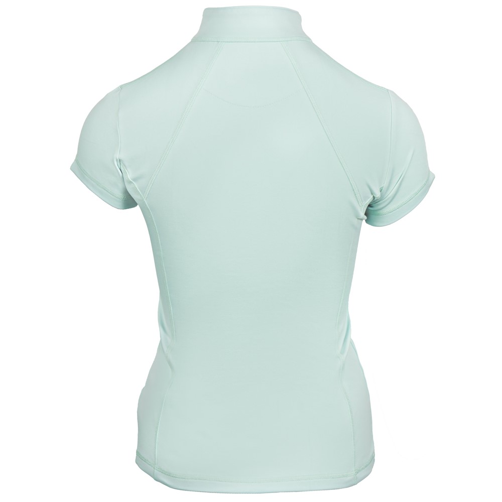 Ce t-shirt élégant à manches courtes est doté d’un col montant et d’une fermeture éclair courte couleur canon de fusil, pour un look moderne et sportif. La poitrine et les épaules sont délicatement ornées de surpiqûres décoratives et de trois rangées de cristaux scintillants, une touche de glamour subtile pour chaque cavalière. Confectionné dans une matière souple et extensible qui épouse parfaitement la silhouette, aussi agréable à cheval qu’en dehors.