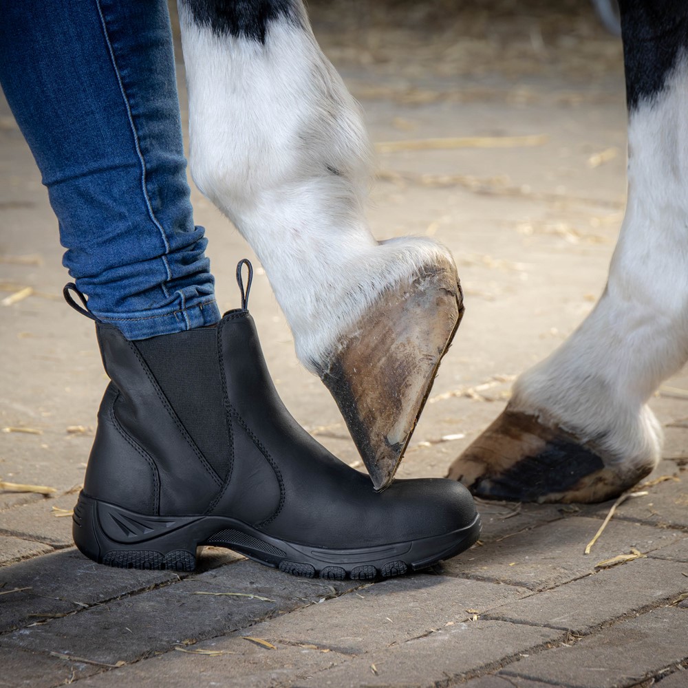 Chaussure d’écurie avec embout de sécurité en acier. L’embout est conforme à la norme EN 12568:2010. Avec renfort supplémentaire au talon, empiècements élastiques autour de la cheville, cuir de haute qualité, doublure douce et respirante, et semelle en caoutchouc antidérapante.