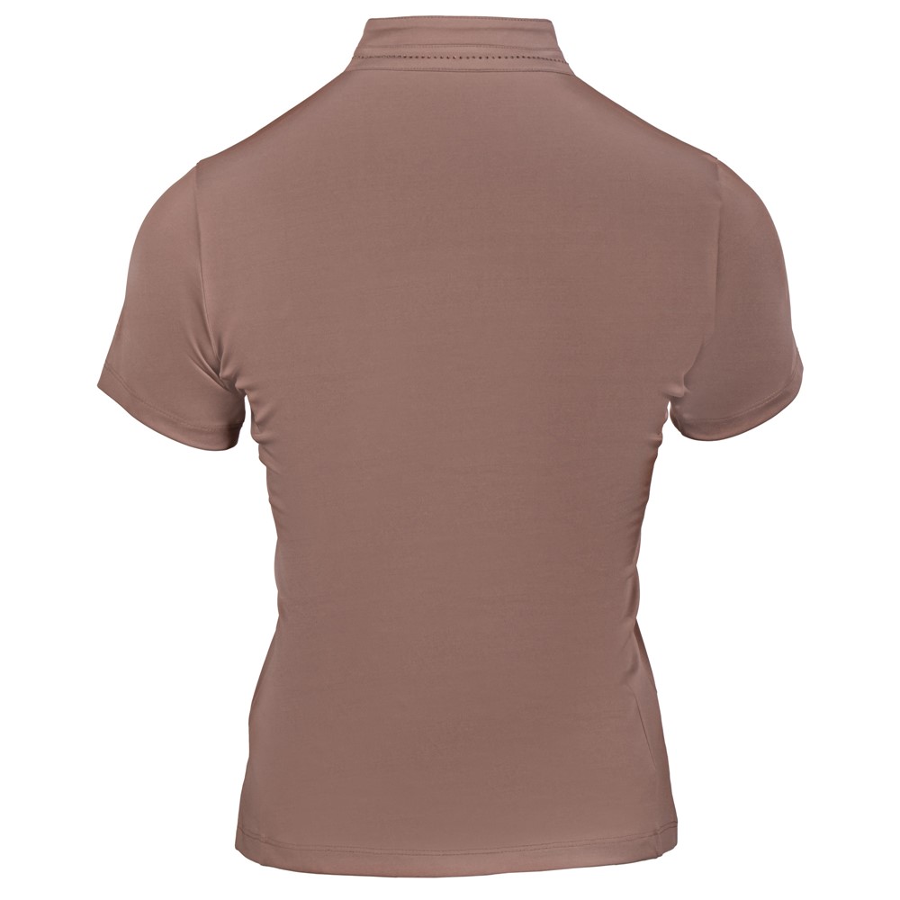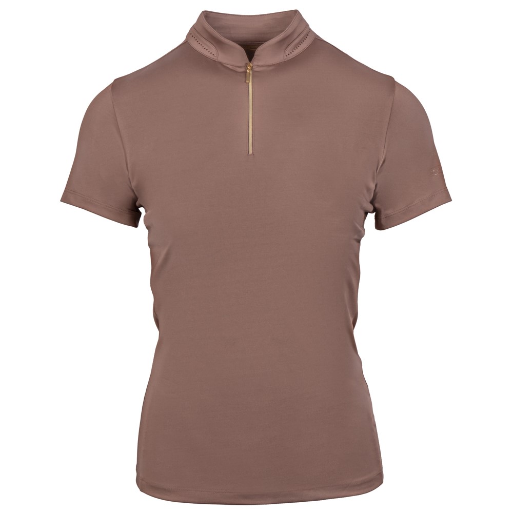 Ce t-shirt est doté d’un col montant chic, agrémenté d’un passepoil supplémentaire orné de cristaux scintillants et d’une fermeture éclair courte. Le logo discret sur la manche gauche apporte une touche finale élégante. Confectionné dans une matière souple et extensible qui épouse parfaitement la silhouette et offre un confort optimal – idéal pour l’entraînement comme pour la compétition.