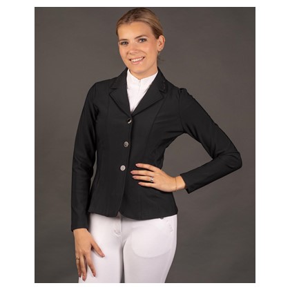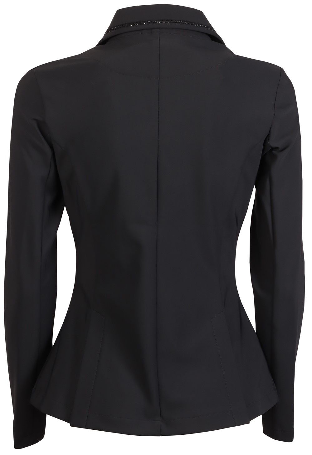 Veste de concours luxueuse en tissu stretch confortable. La veste est ornée de cristaux noirs sur le col et dispose de deux poches zippées. Une fermeture à boutons avec une fermeture éclair en dessous assure un ajustement parfait.