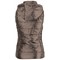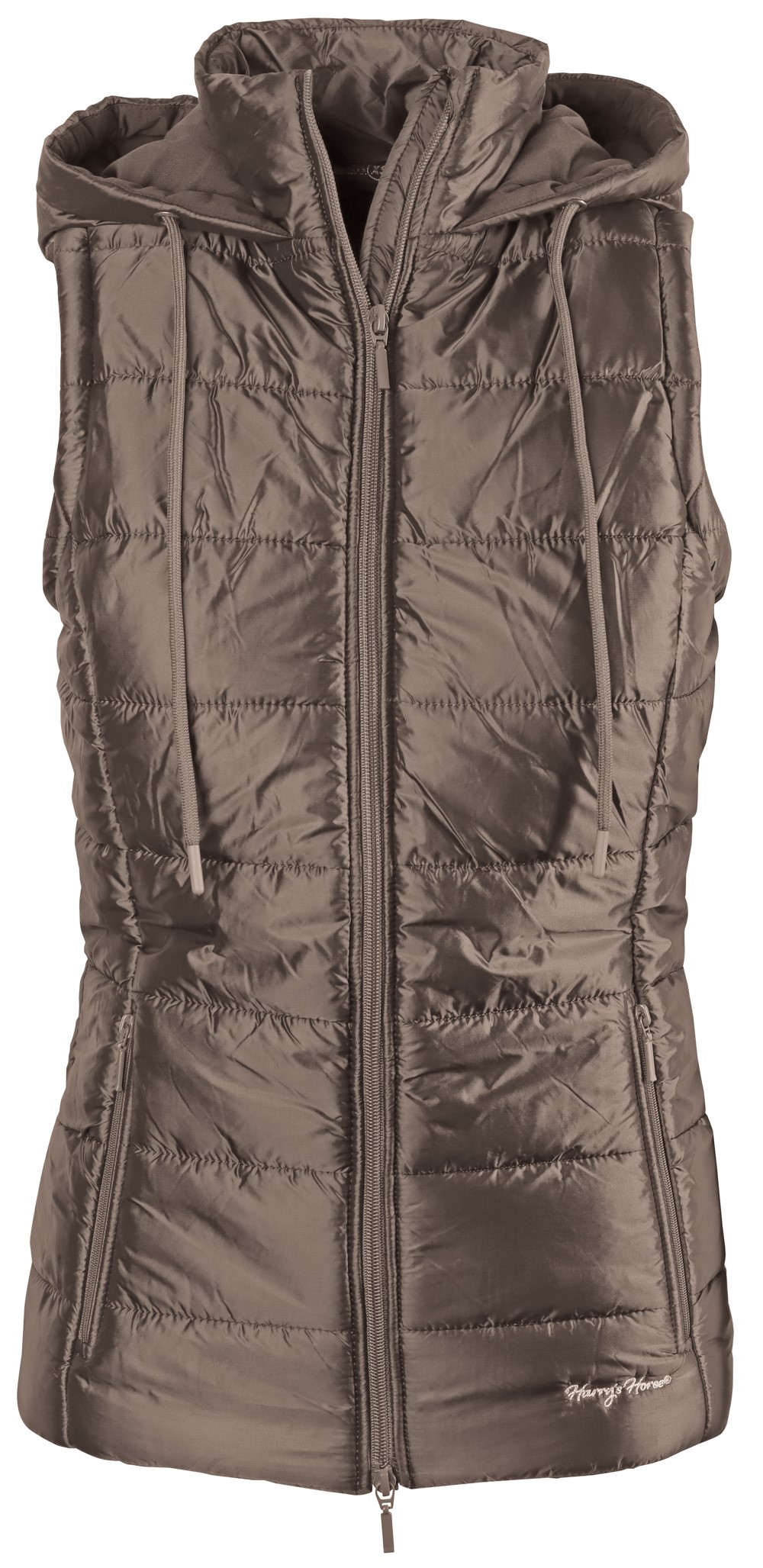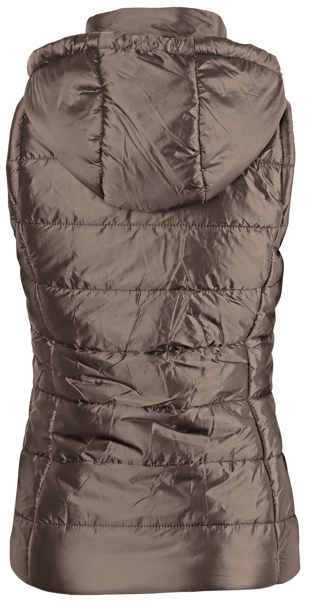 Bodywarmer avec fermeture éclair double sens, deux poches zippées, capuche avec cordon de serrage, et une boucle d'accrochage.
