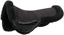 Amortisseur de dos mérinos, pattes d'attache en velcro, découpe à la colonne. Taille Poney/Cob, convient pour les selles 15" et 16". Dessus 65% polyester, 35% coton. Doublure 100% laine mérinos.