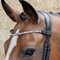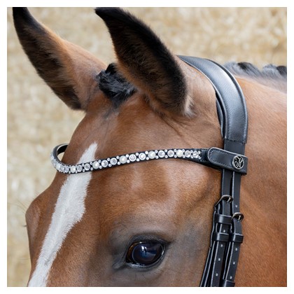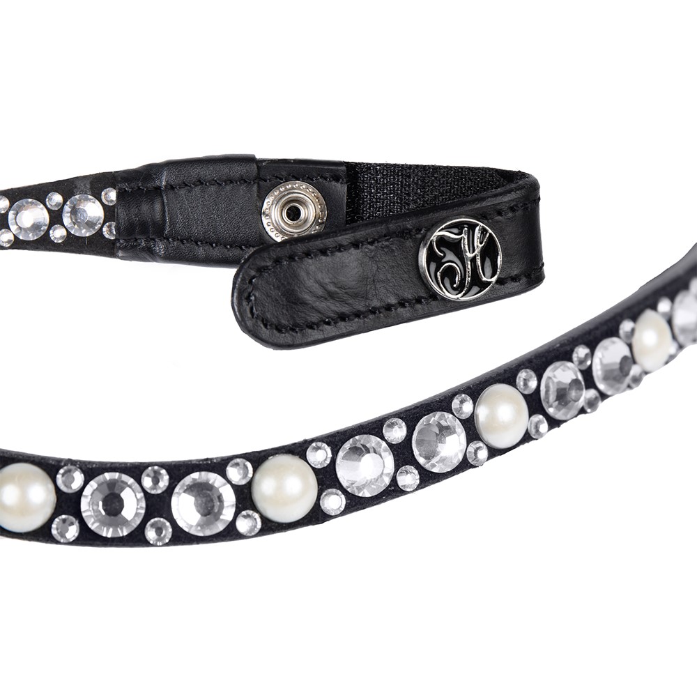 Lederen frontriem met zilverkleurige kristallen en parels. Eenvoudig te verwisselen dankzij drukknopen aan de zijkanten.
