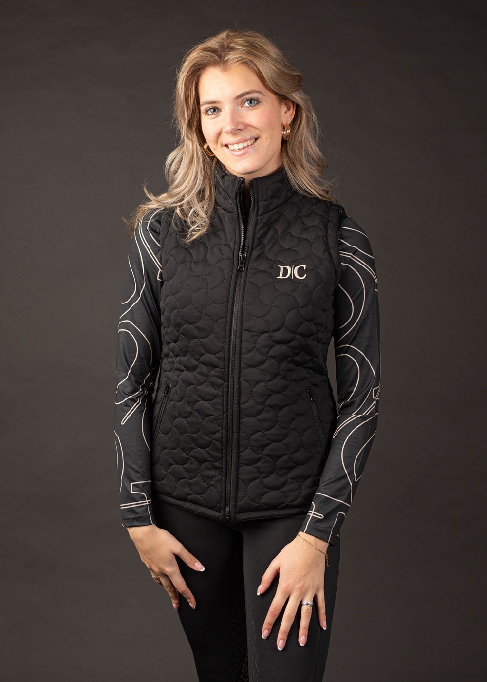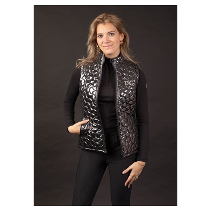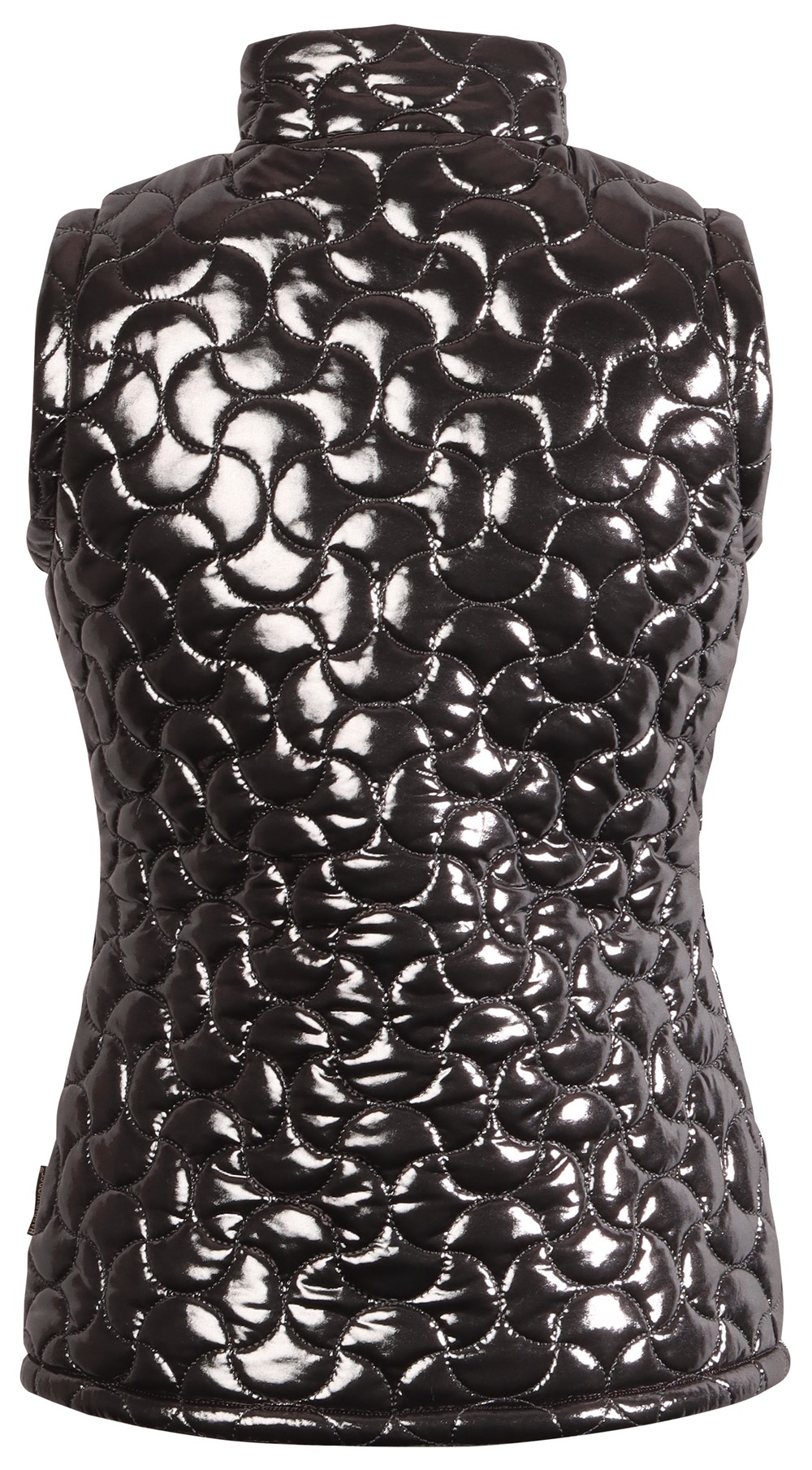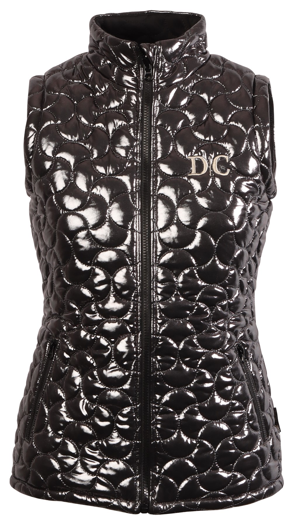 Twee-in-een bodywarmer, te dragen met de zwarte kant of de glimmende kant naar buiten, tweeweg-ritssluiting, twee zakken met een ritssluiting, Denici Cavalli borduursel op beide zijden.