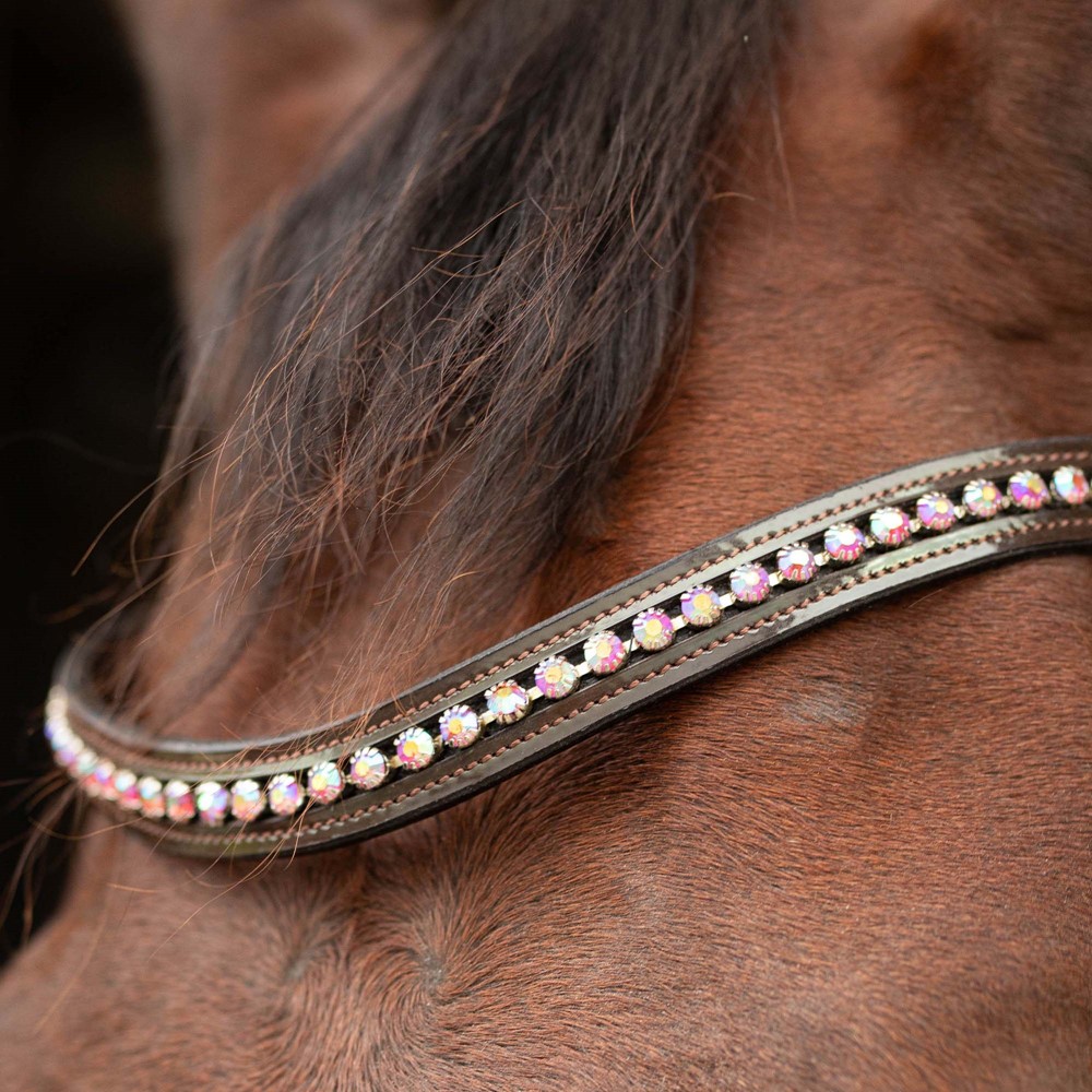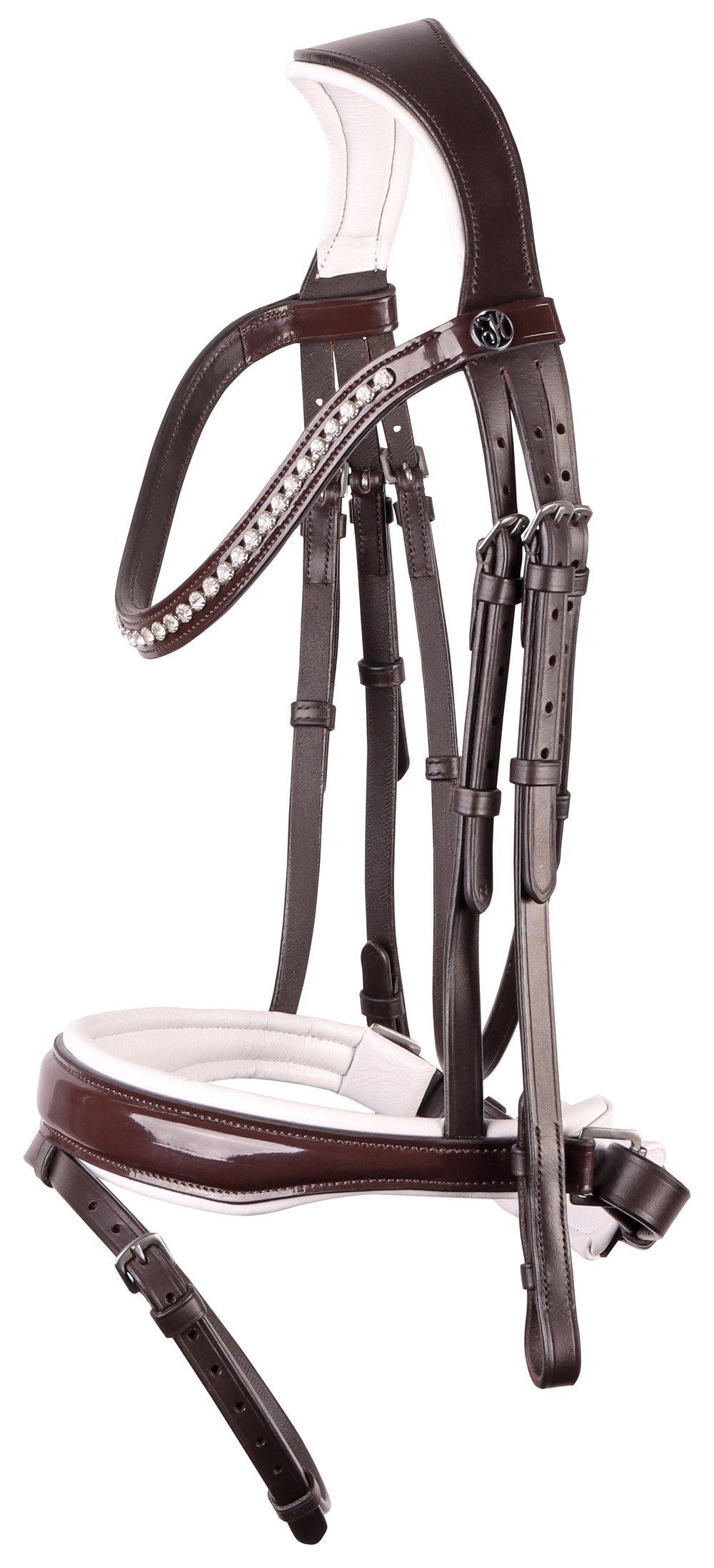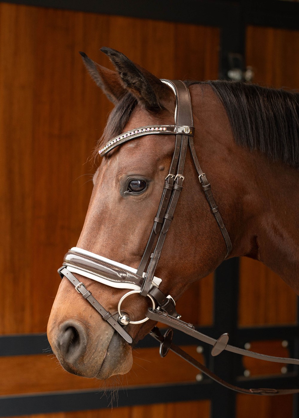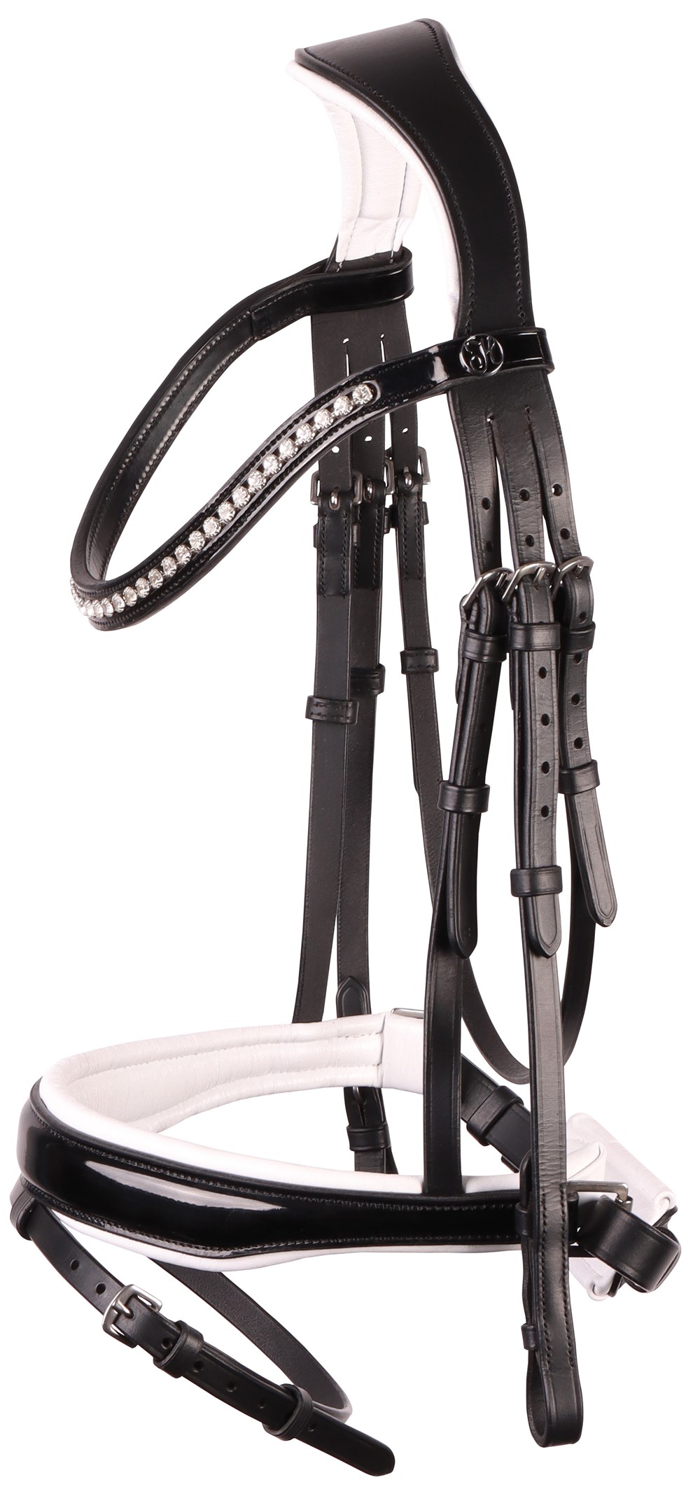 Lederen hoofdstel met gecombineerde neusriem. De luxe, brede aansnoerneusriem met lak is 4CM breed (incl. witte padding) en is anatomisch gevormd rond het bit. Met speciaal, anatomisch, zacht onderlegd kopstuk. Elegante smalle riempjes voor onder andere de keelriem. Uitgevoerd met luxe, hangende frontriem met lak en schitterende AB-kristallen. Blinde sluitingen aan bakstukken en teugels.