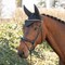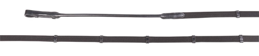 Lederen rondgenaaid hoofdstel met lak op de neusriem. Voorzien van aansnoerneusriem. Bakstukken, keelriem en uiteinde van de teugels zijn rond genaaid.