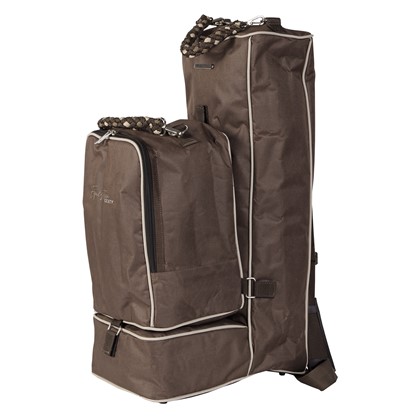 Praktische en stijlvolle laarzentas met ritssluiting aan de achterzijde. Aan de voorkant bevindt zich een afneembare (cap)tas met klittenbandsluiting, ideaal voor je cap, verzorgingsartikelen of persoonlijke spullen. Gemaakt van stevig 600D polyester en afgewerkt met speelse kunstleder-paspels en een gevlochten handvat in vrolijke kleuren. Op het voorvak is het Equestrian Society logo geprint voor een herkenbare uitstraling.